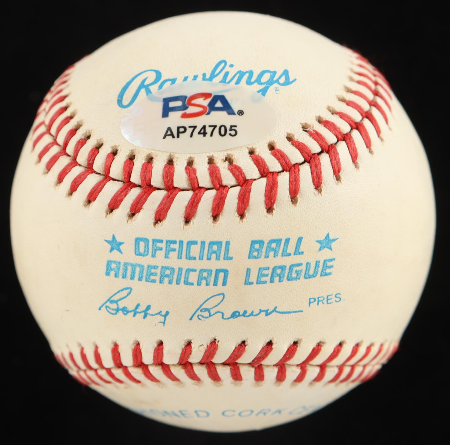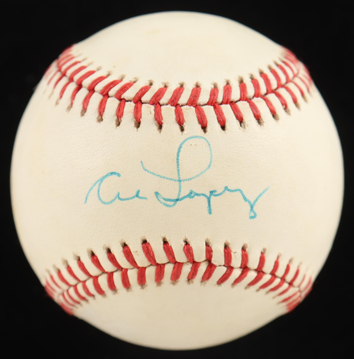 Rawlings Official American League baseball. Has been hand-signed by Al Lopez (D. 2005, Cleveland Indians, HOF). Please note, ball has been stained and naturally tone. Refer to photos for more details.