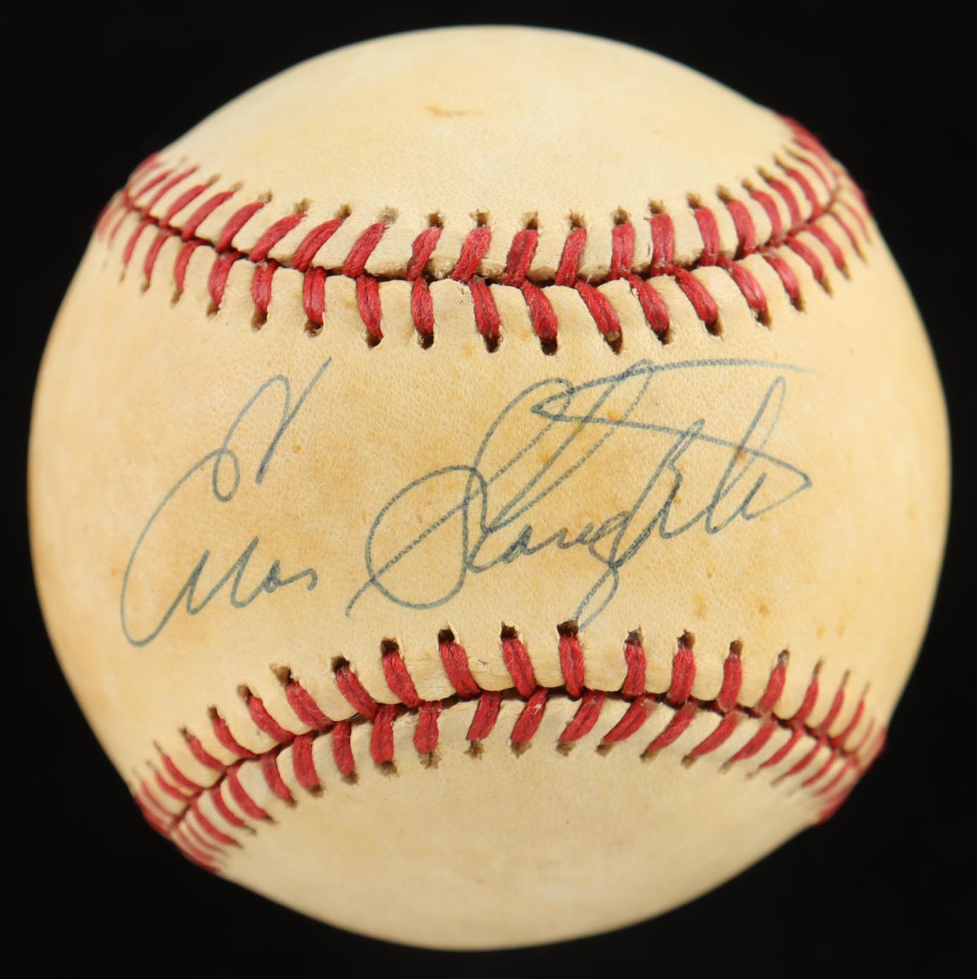 Rawlings Official National League baseball. Has been hand-signed by Enos Slaughter (D. 2002, New York Yankees, HOF). Please note, ball has been stained and naturally tone. Refer to photos for more details.