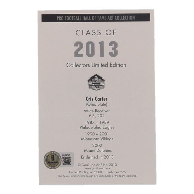 Postcard measures approximately 4" x 6" in size. Hand-signed and inscribed by Cris Carter (Minnesota Vikings, HOF). Please note, the postcard is limited edition of 5,000 produced.