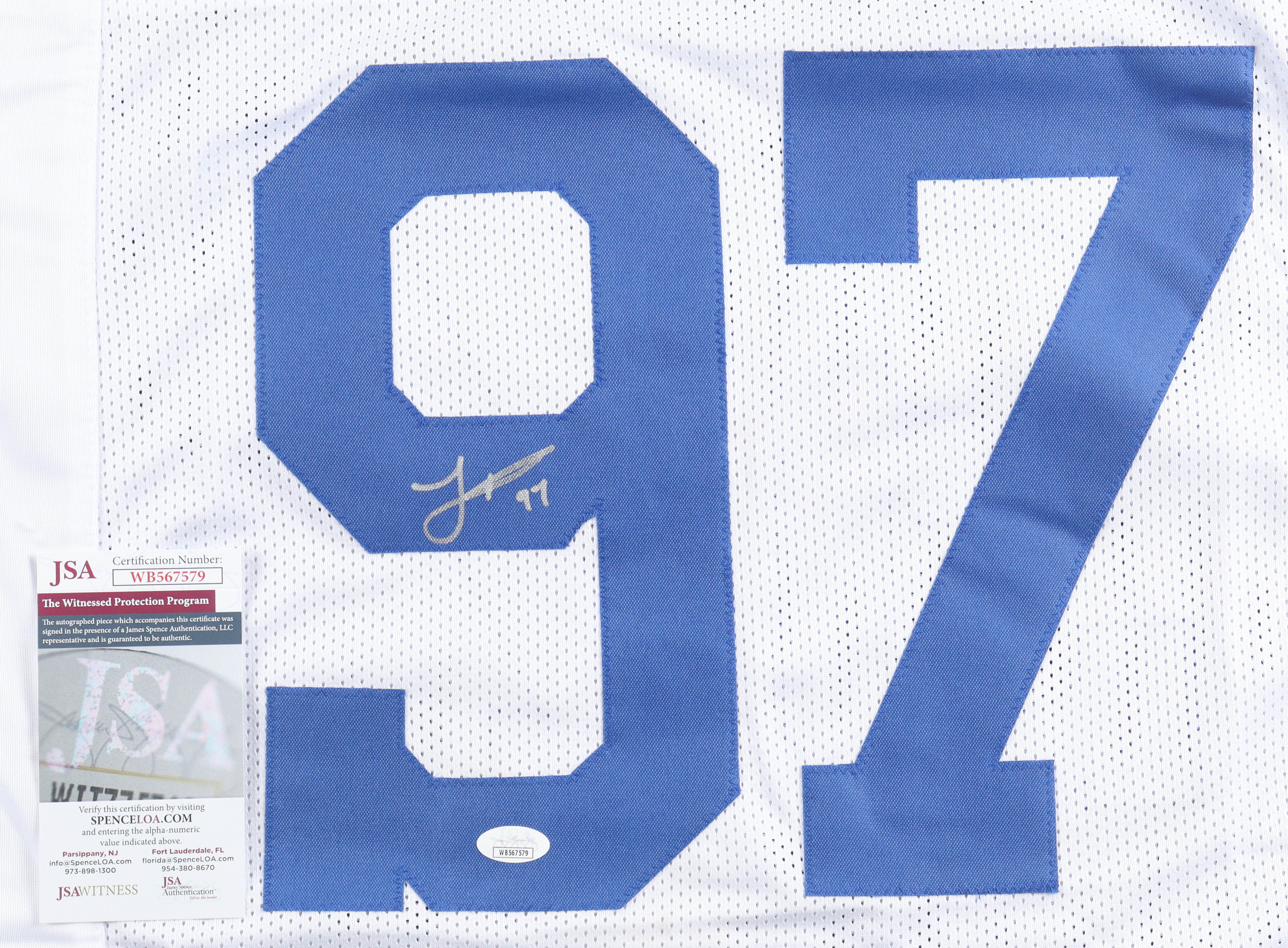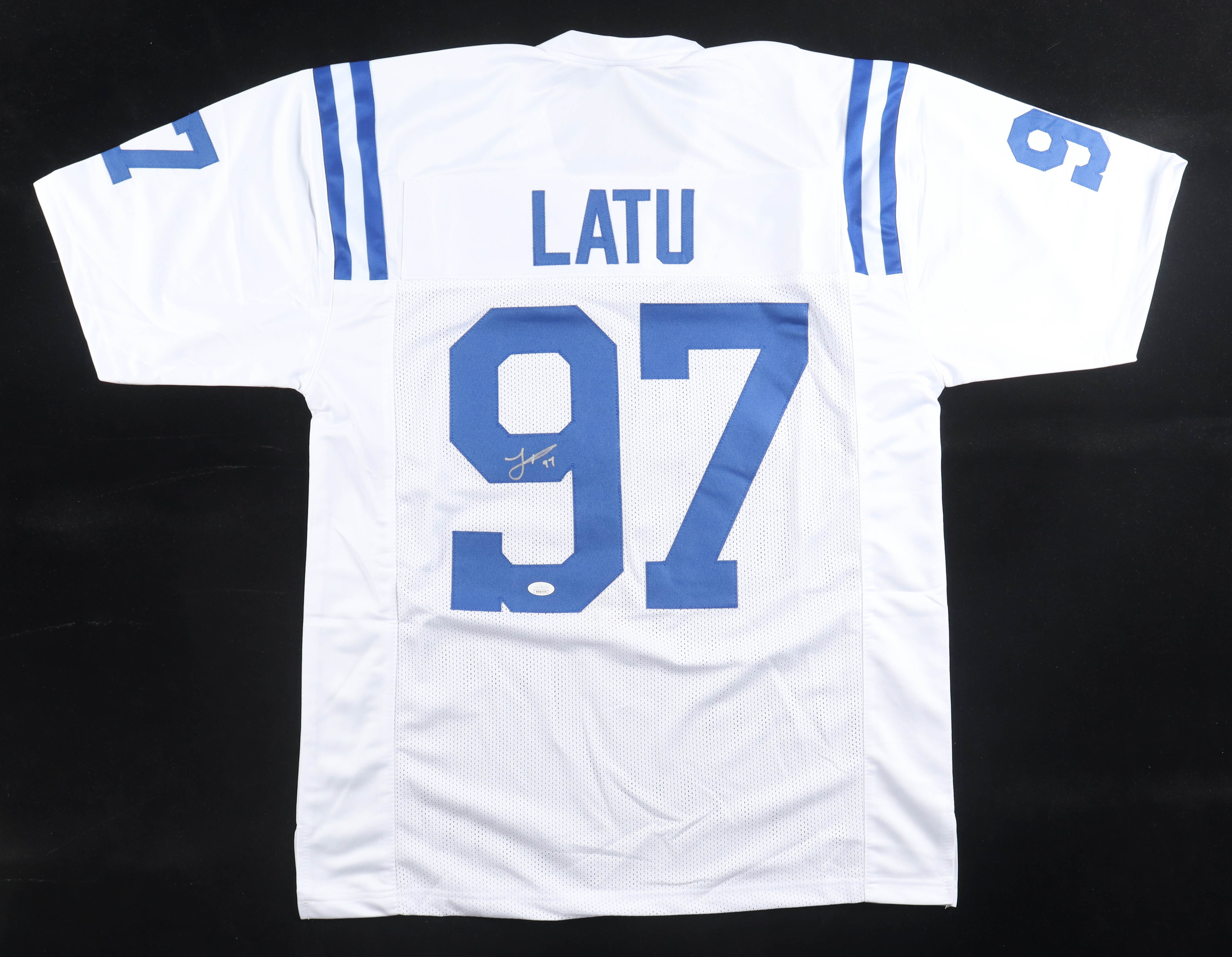 Custom jersey with everything sewn on, size XL. Hand-signed by Laiatu Latu.