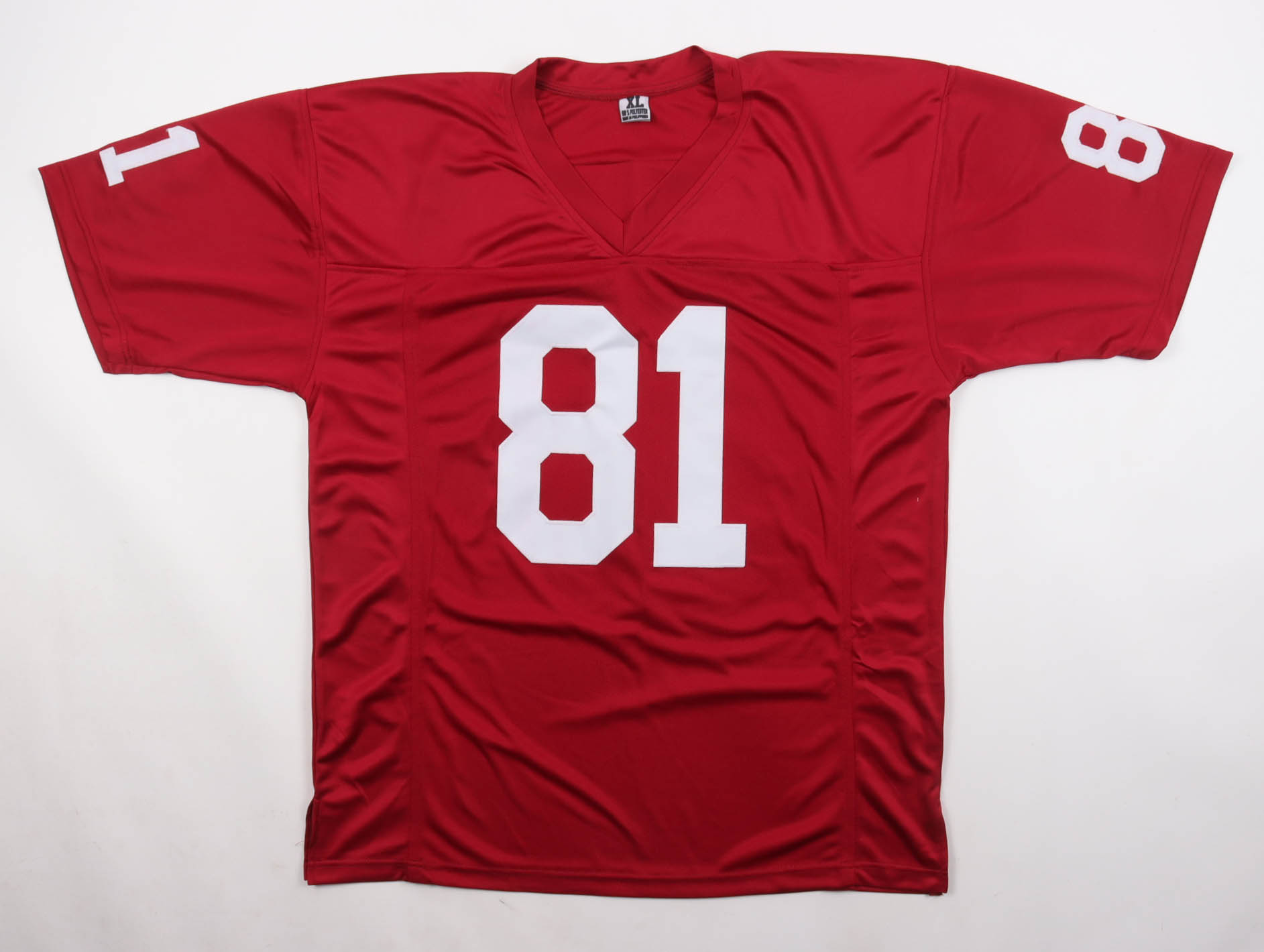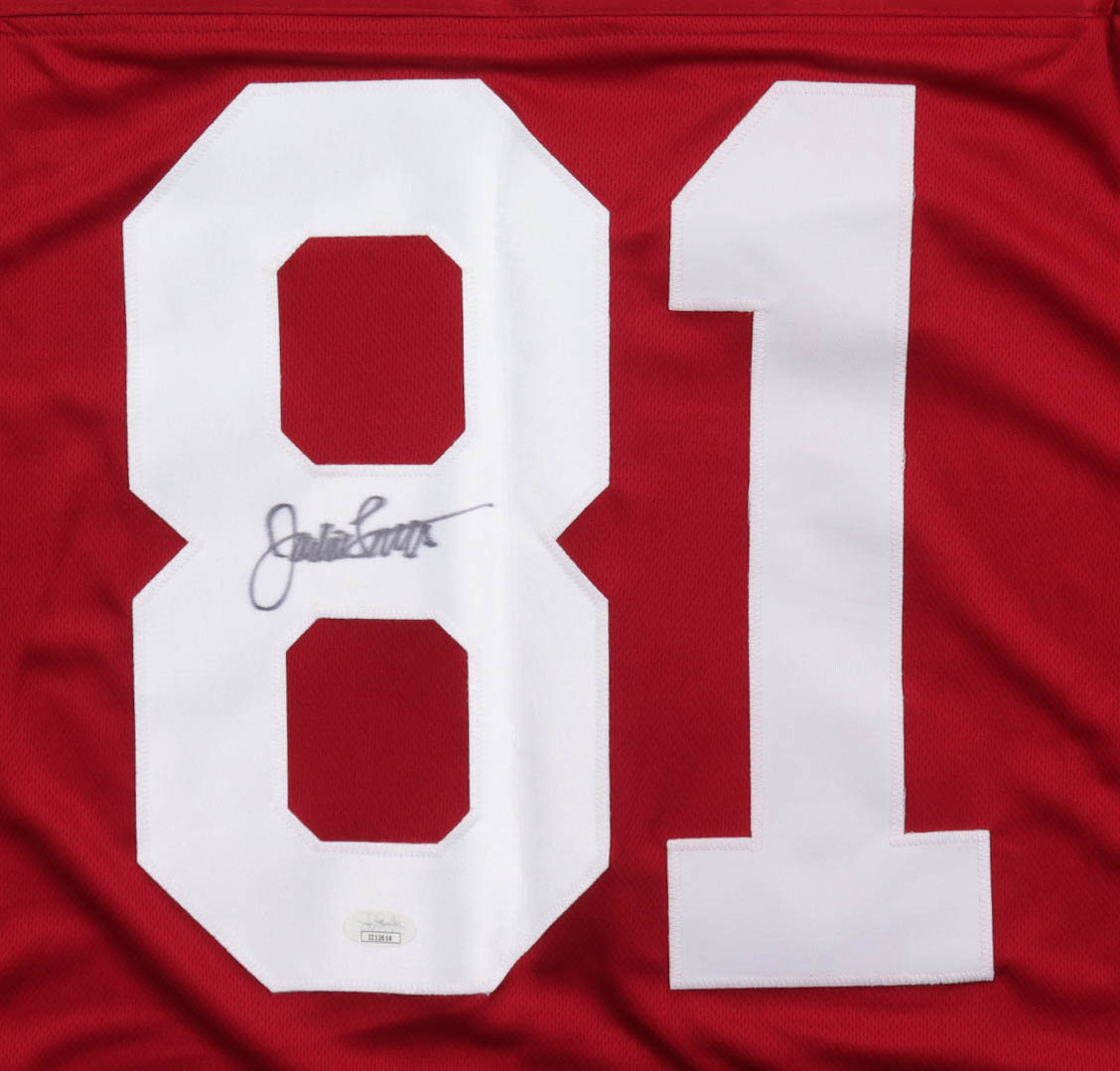 Custom jersey with everything sewn on, size XL. Hand-signed by Jackie Smith (HOF). Please note, the signature has bled.
