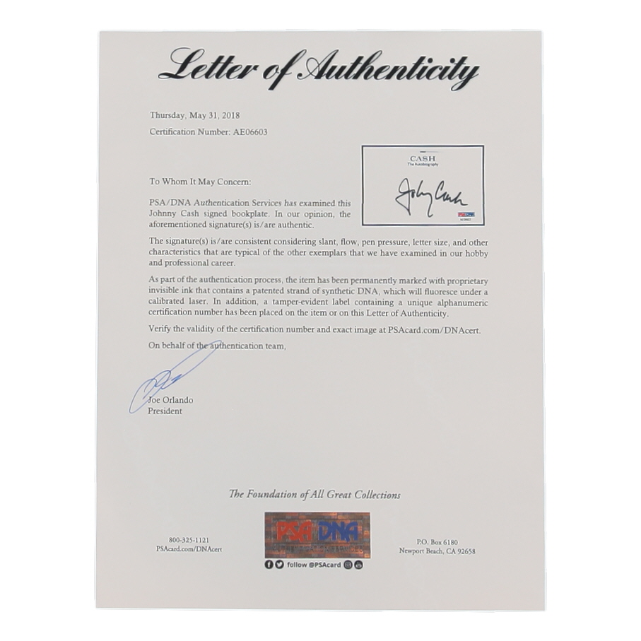 Book plate cut measures approximately 4" x 6" in size. Hand-signed by Johnny Cash (D. 2003).
