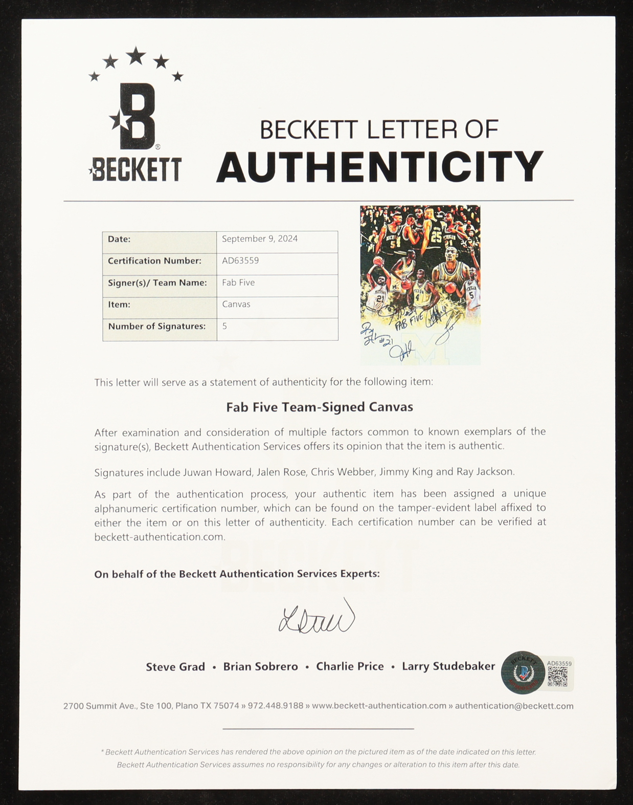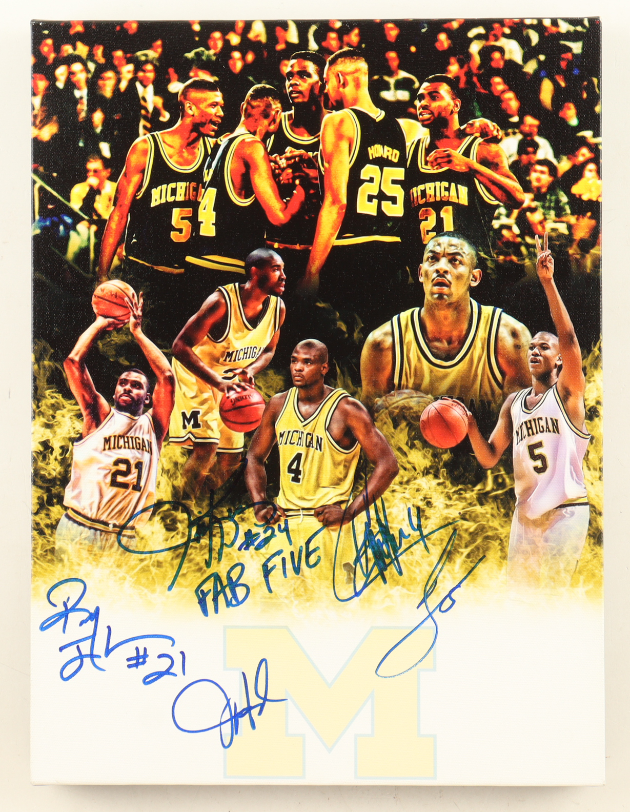 Canvas measures approximately 12" x 16" in size and has been hand-signed by Juwan Howard, Jalen Rose, Chris Webber, Jimmy King and Ray Jackson.