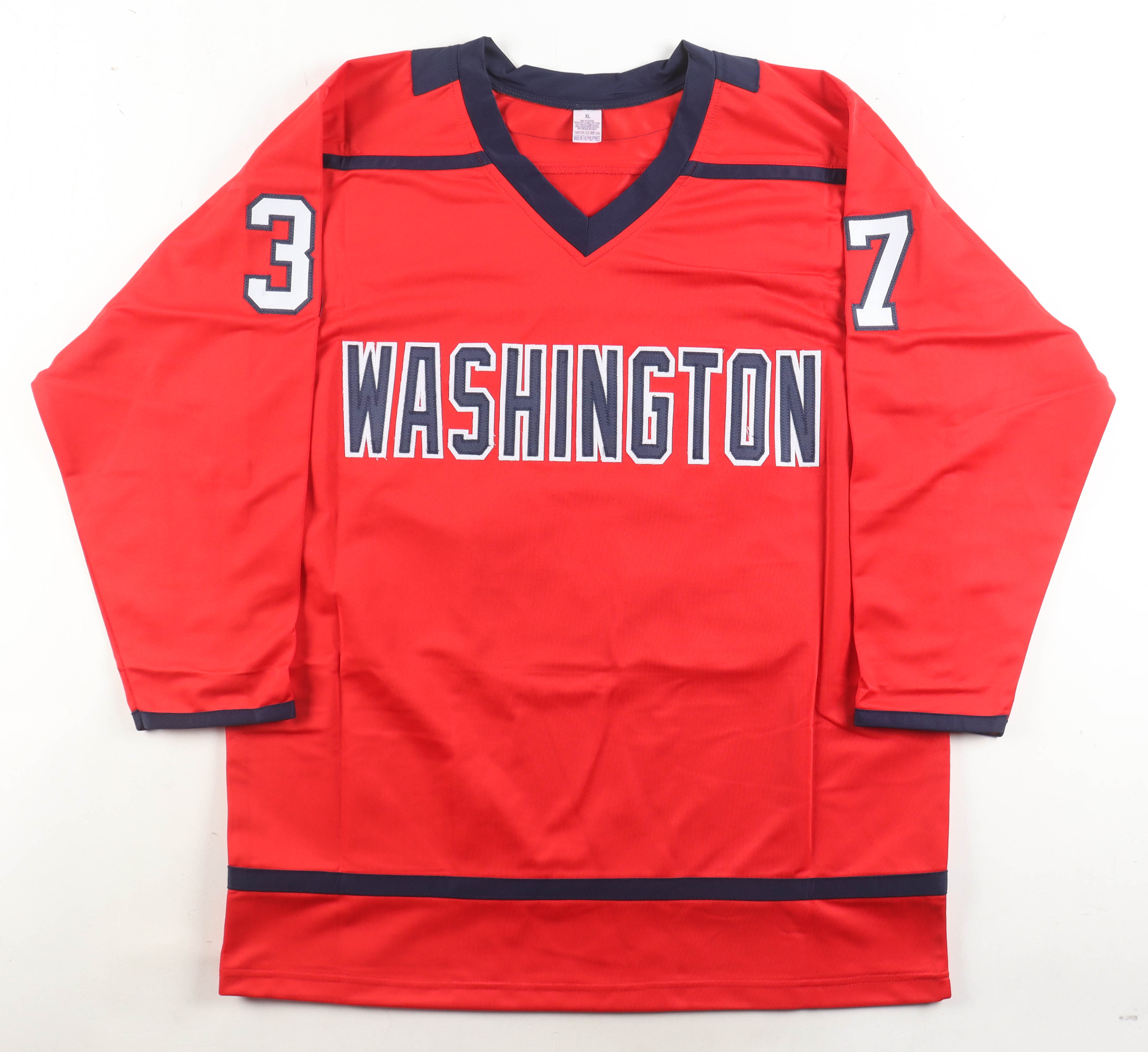 Custom jersey with everything sewn on, size XL. Hand-signed and inscribed by Olaf Kolzig (Washington Capitals).