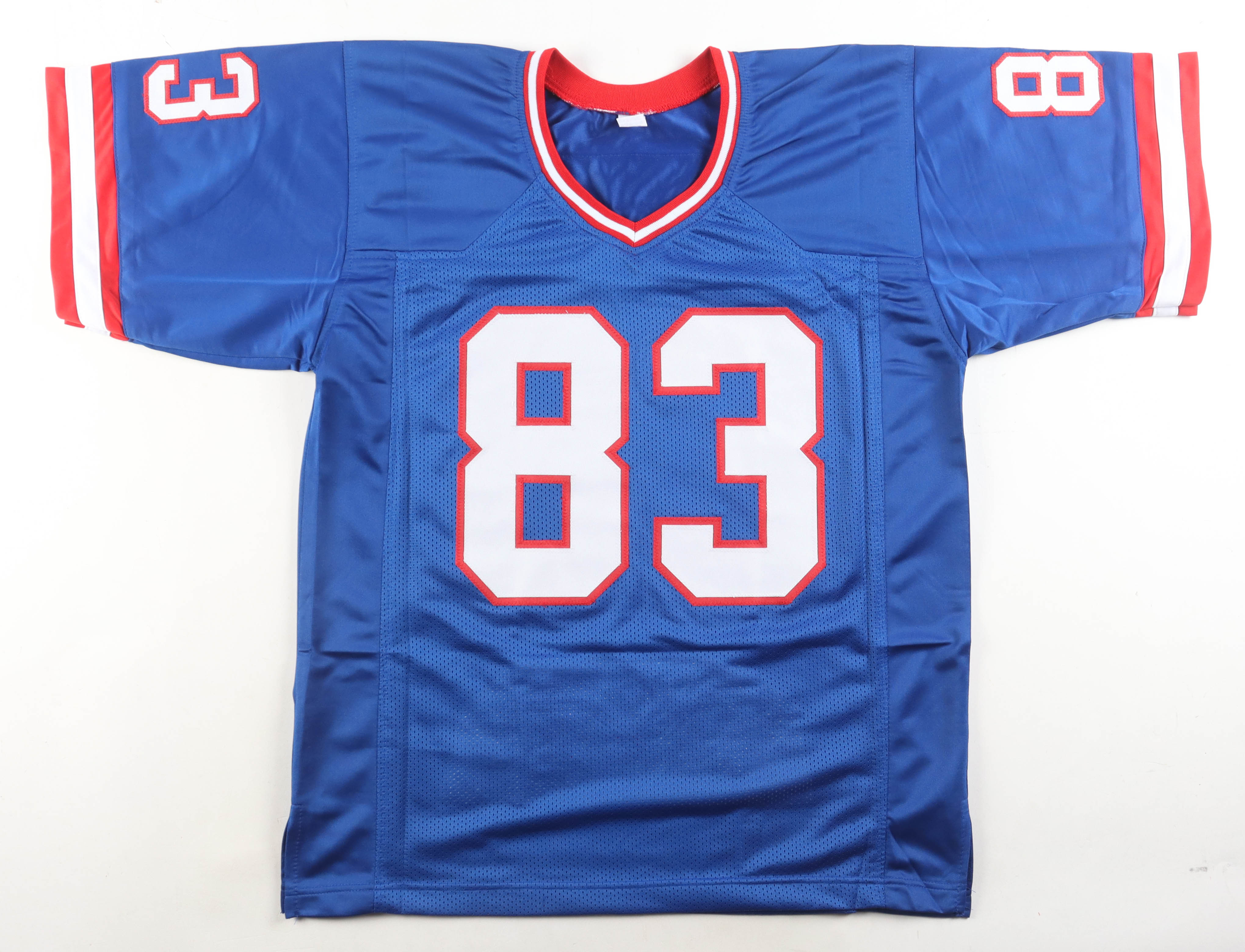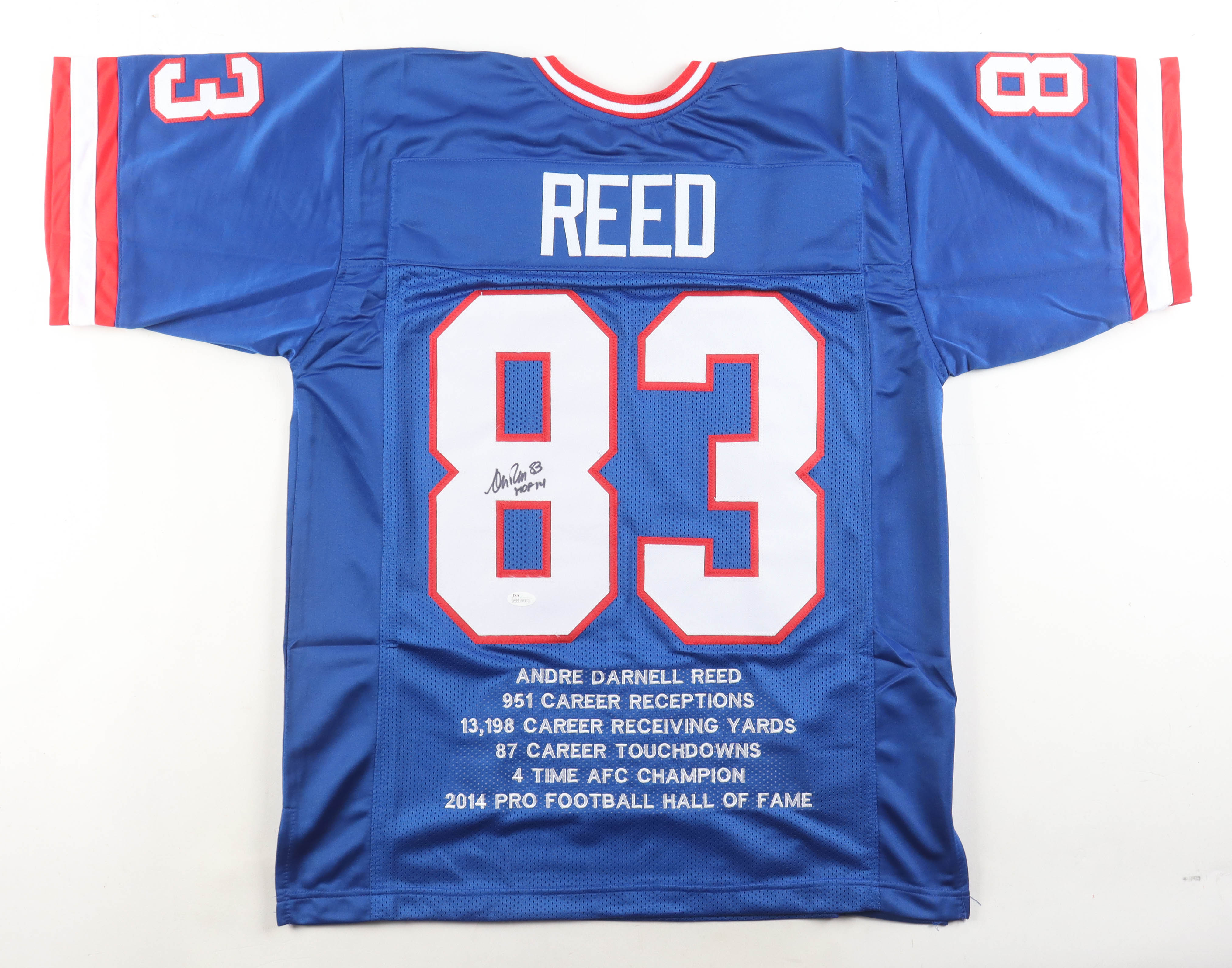 Custom jersey. Everything is sewn on, size XL. Hand-signed by Andre Reed (Buffalo Bills, HOF). Reed's career highlights have been custom stitched onto the back of the jersey below the reverse numbers.