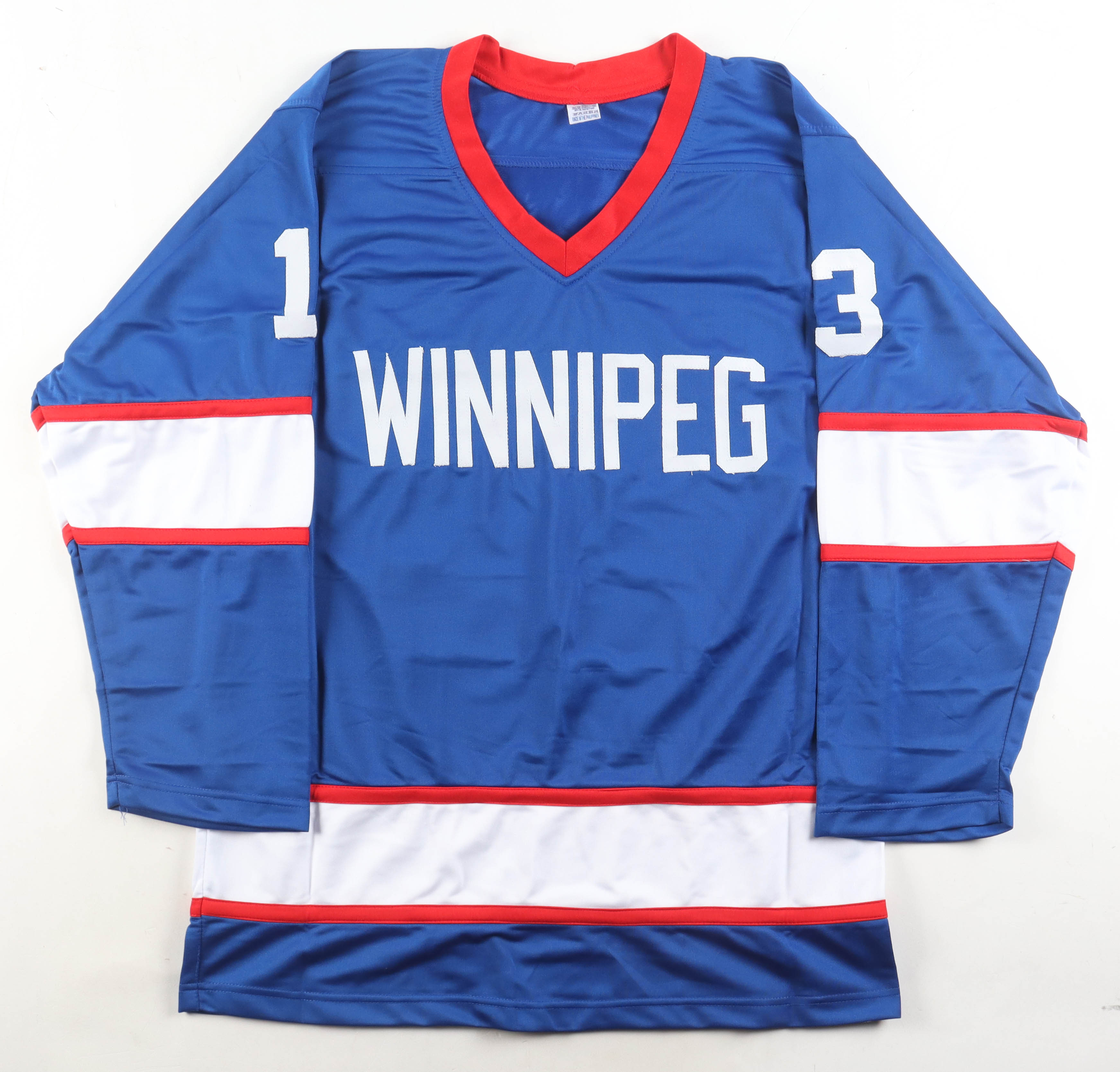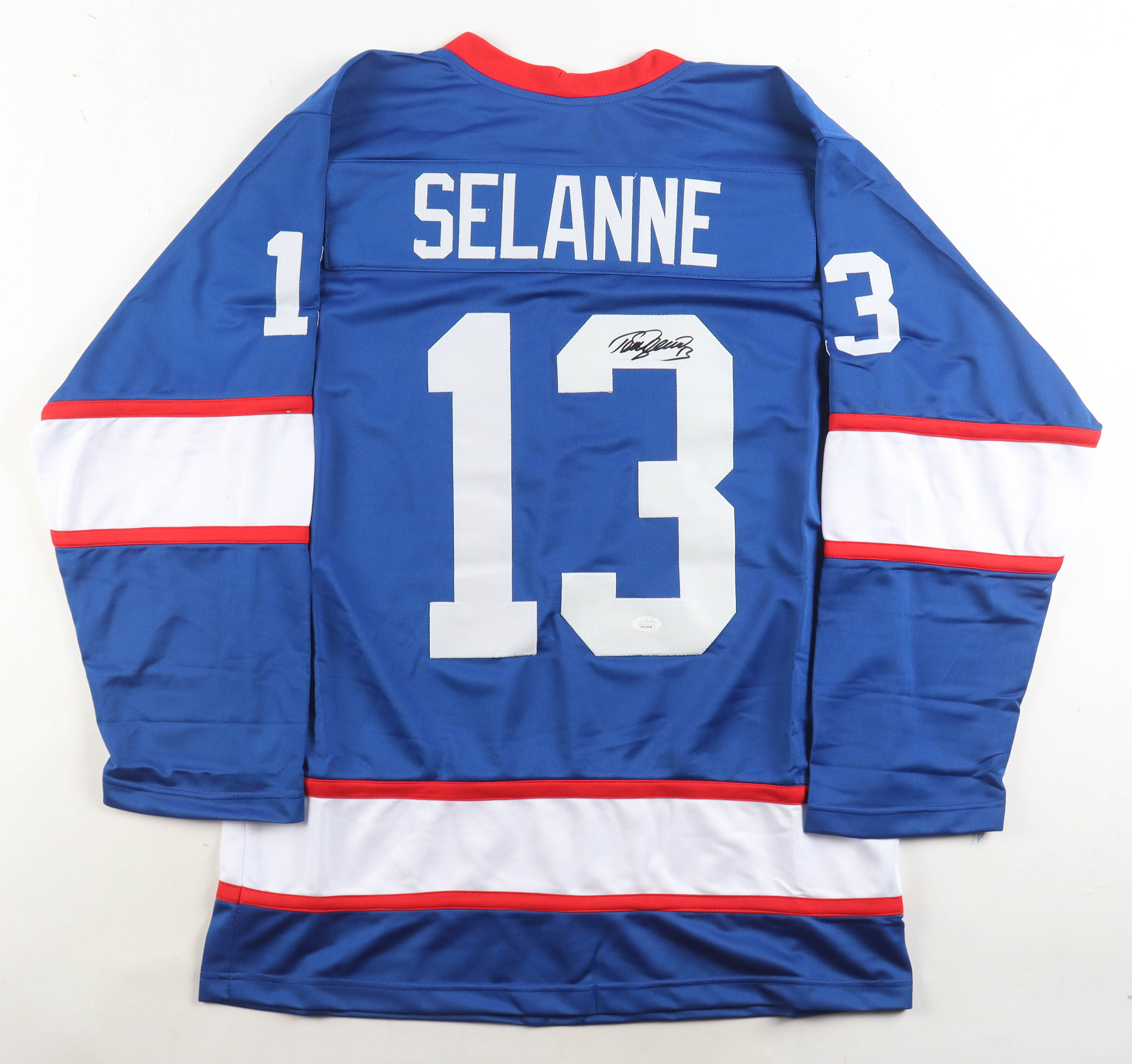 Custom jersey with everything sewn on, size XL. Hand-signed by Teemu Selanne (Winnipeg Jets, HOF).