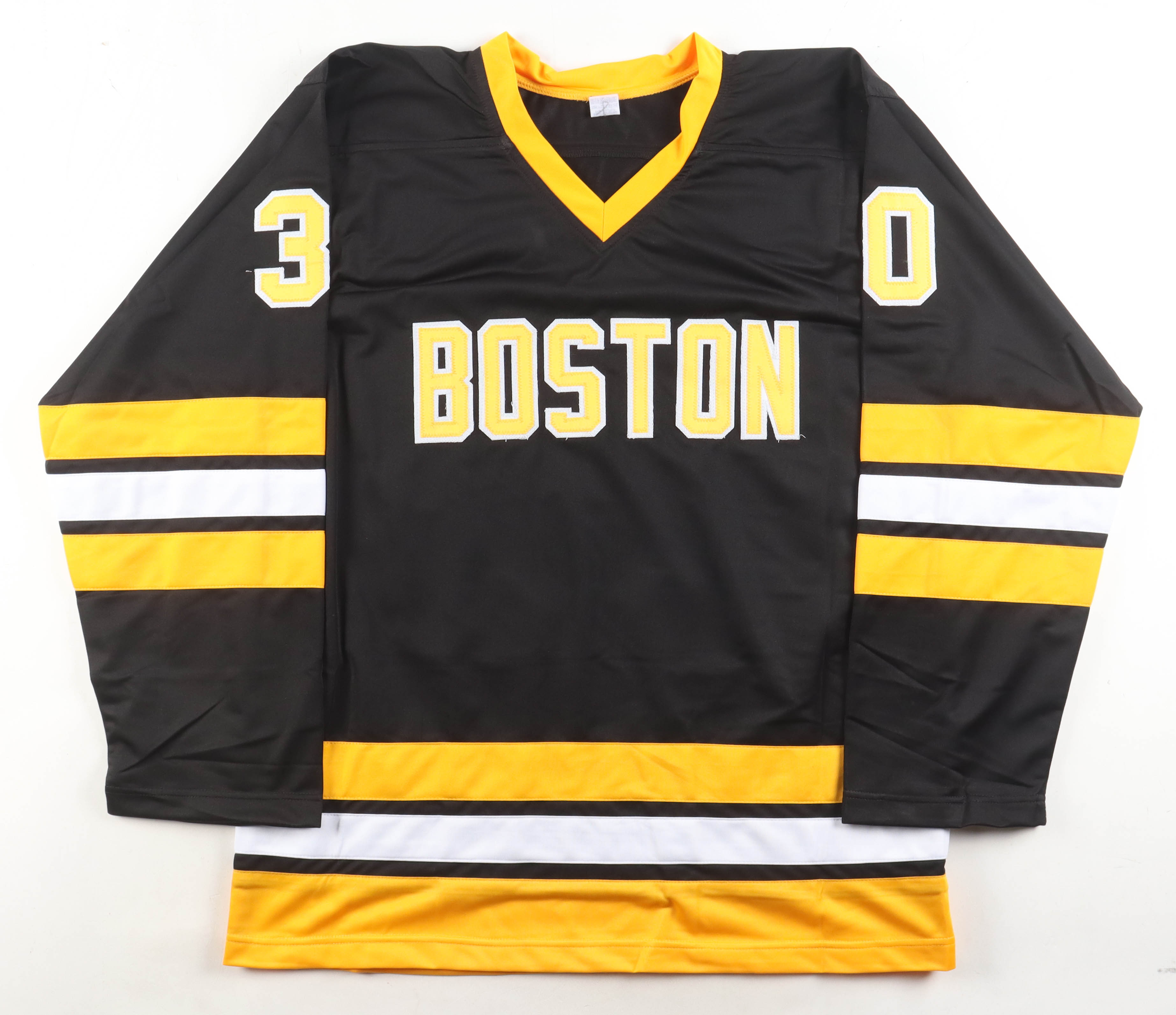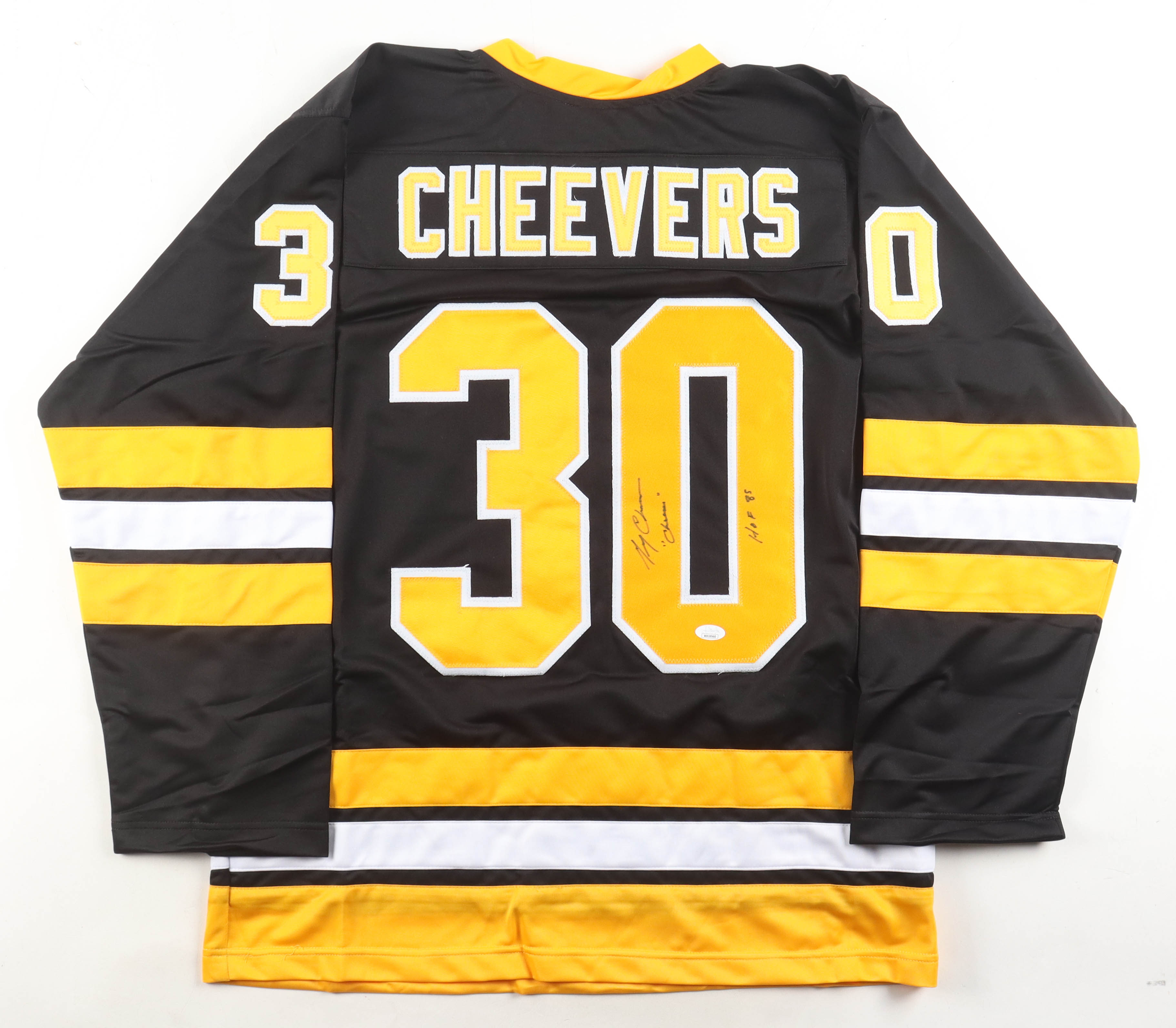 Custom jersey with everything sewn on, size XL. Hand-signed and inscribed by Gerry Cheevers (Boston Bruins, HOF).