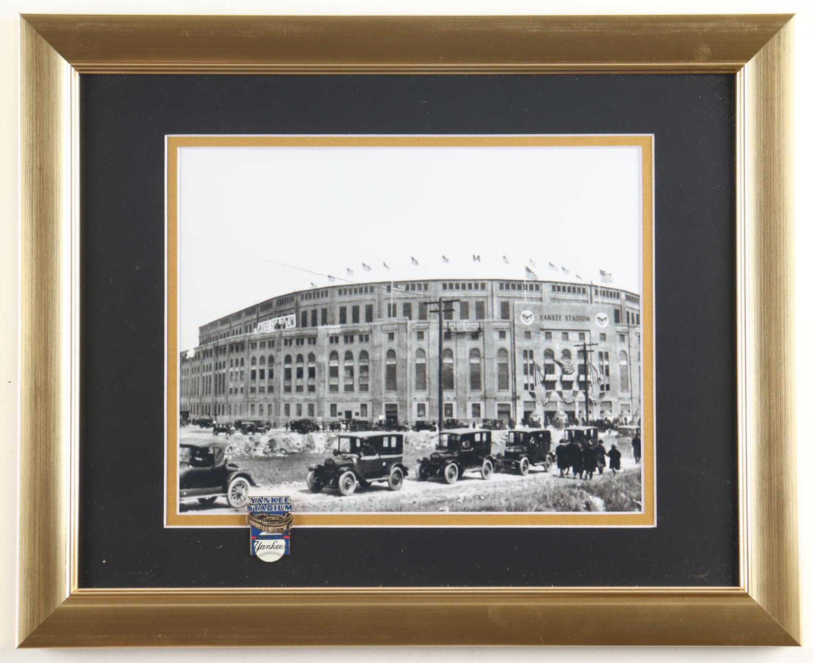 Custom frame measures 13" x 16" in size, featuring a photo of the original Yankees Stadium. Display also includes a vintage Yankees pin. Please note that the item is unsigned.