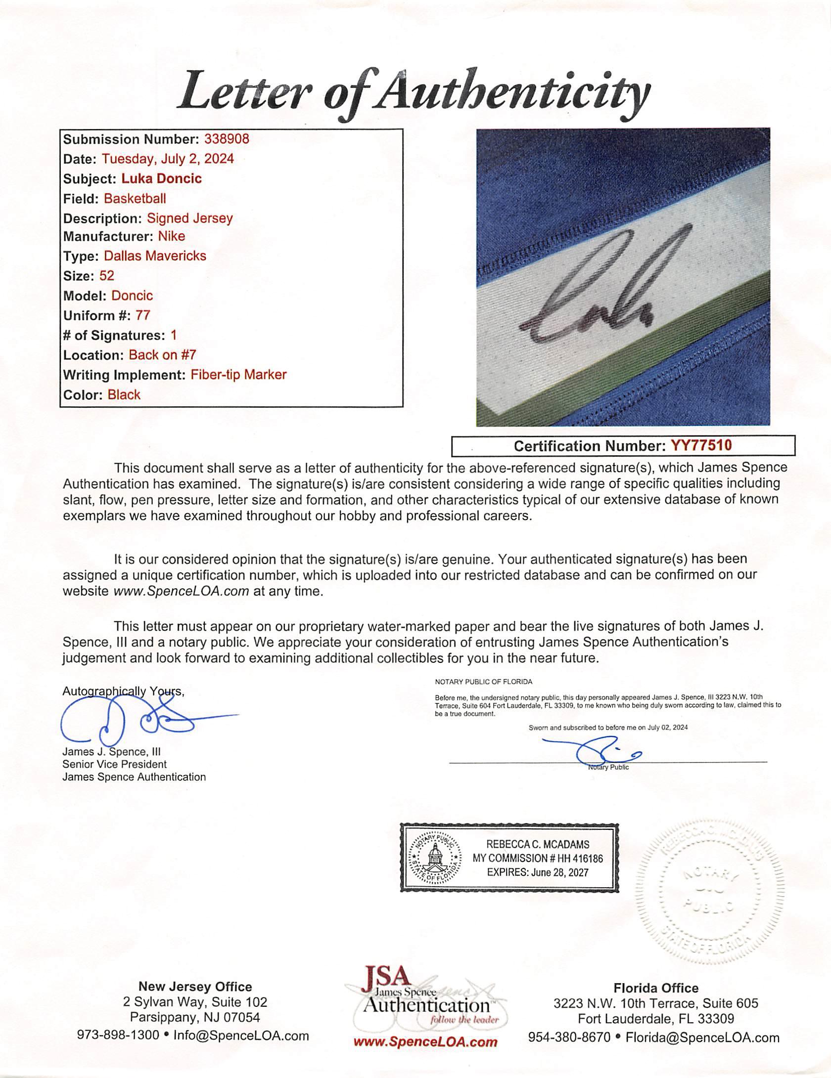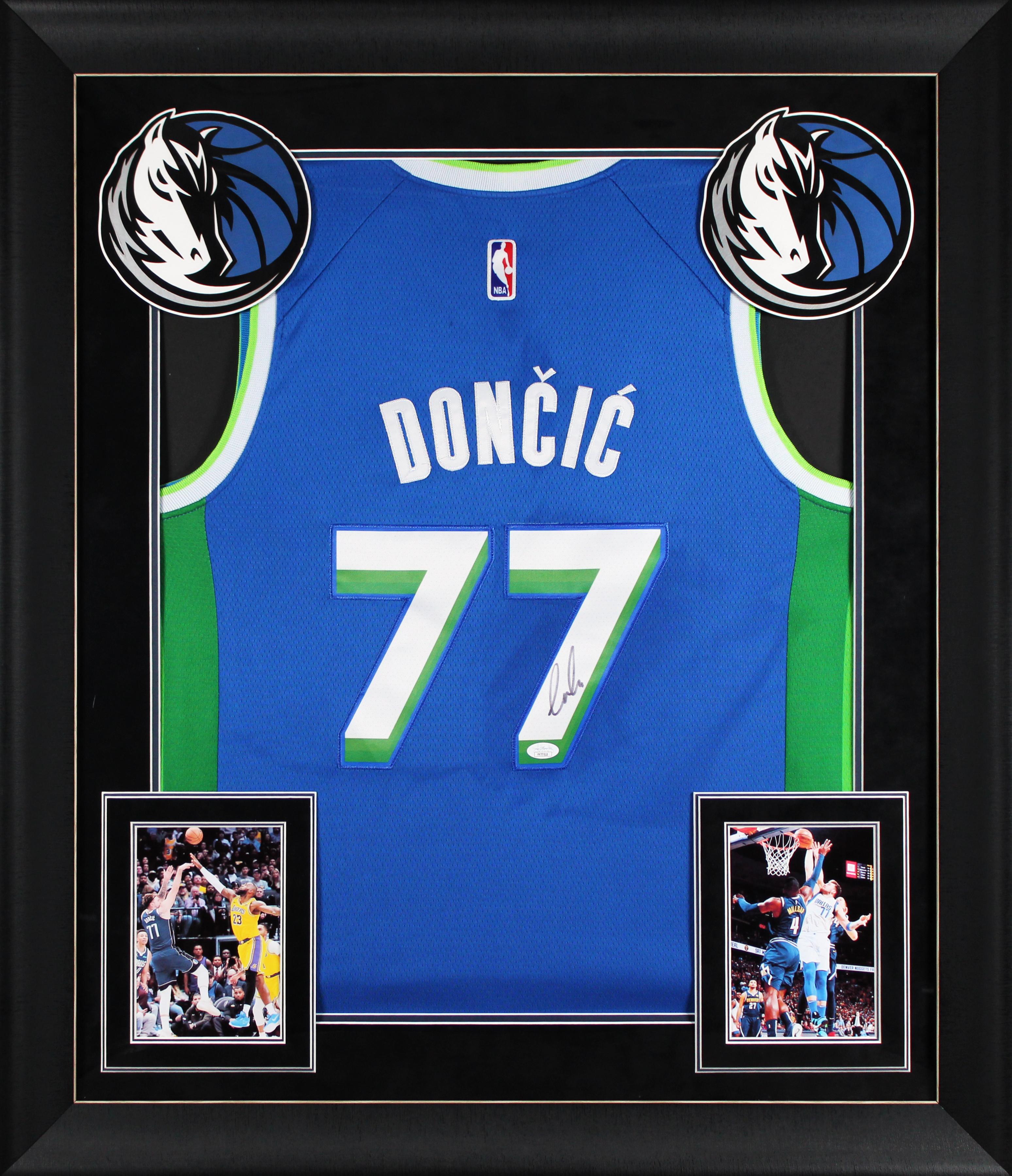 Custom frame measures approximately 32" x 37" in size and features a jersey that has been hand-signed by Luka Doncic (Dallas Mavericks).