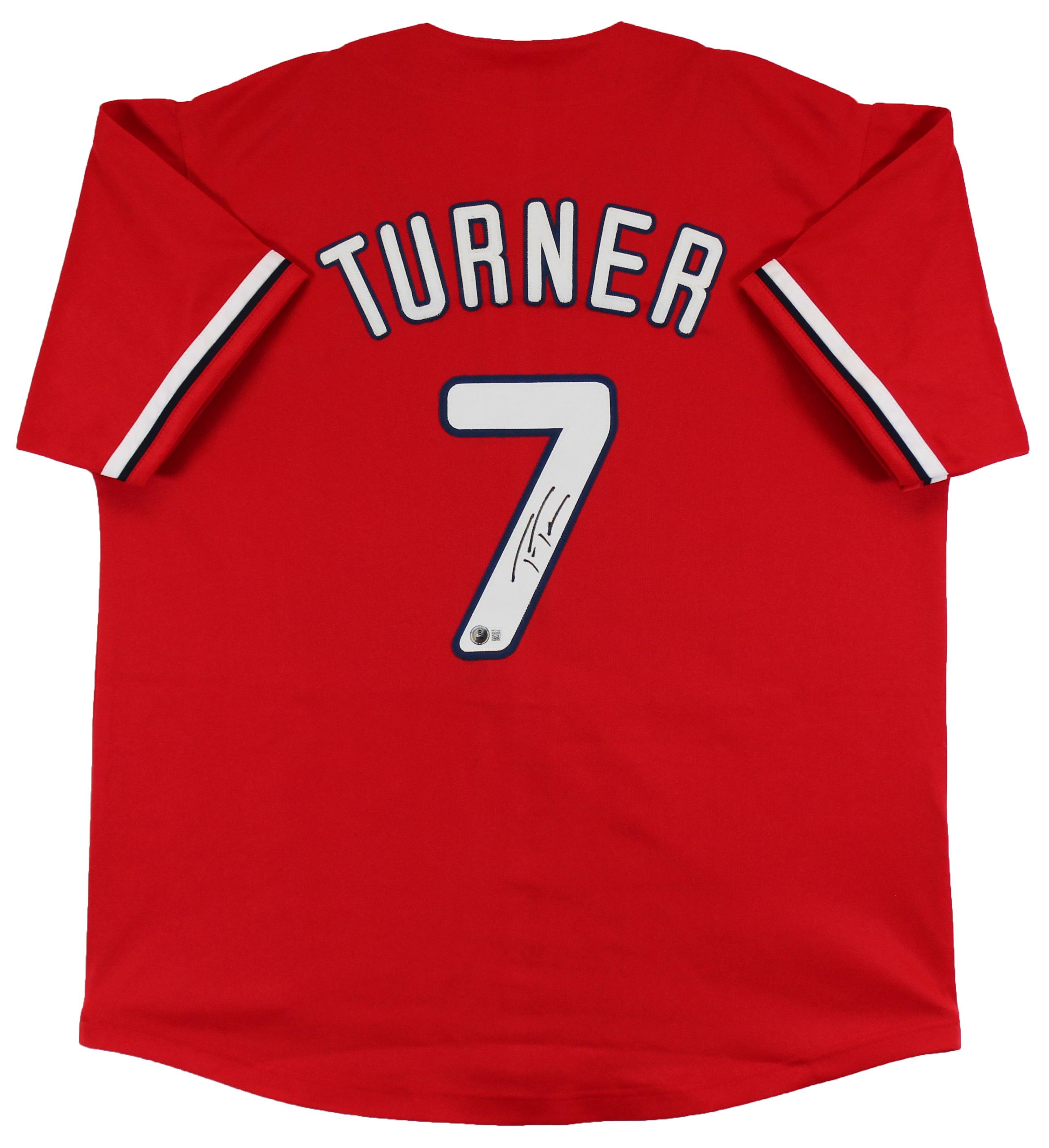 Custom jersey with everything sewn on, size XL. Has been hand-signed by Trea Turner.