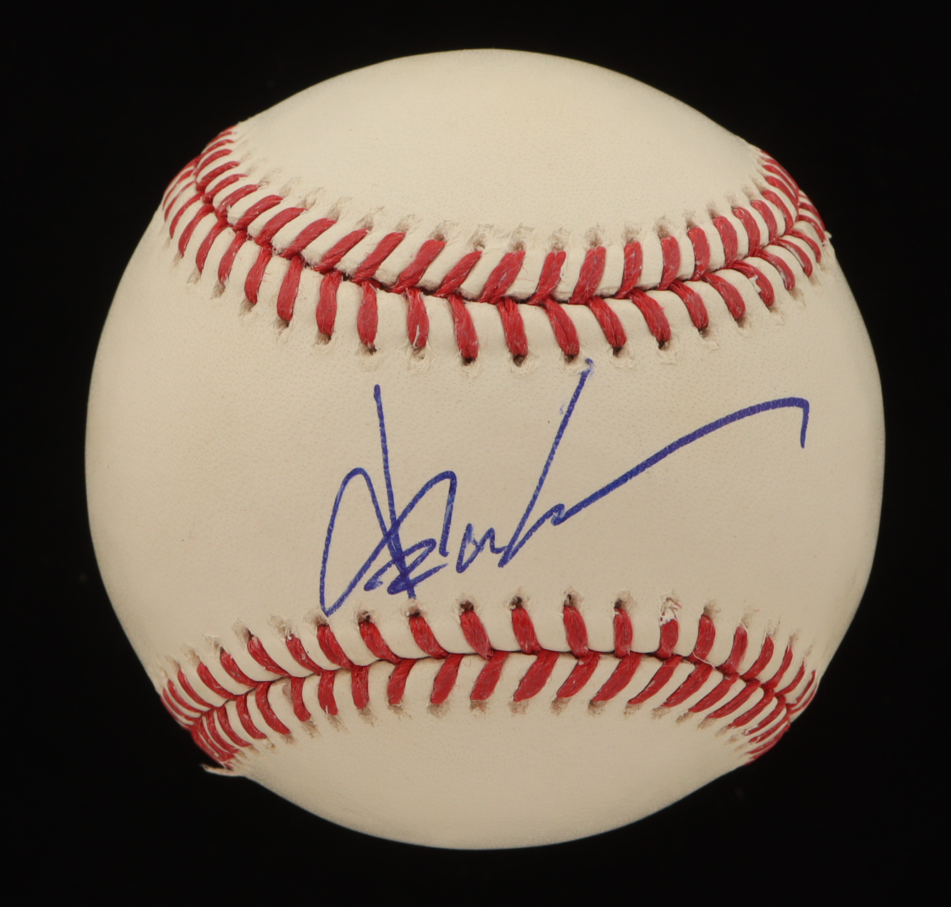 Rawlings Official Major League Baseball. Hand-signed by Yoshinobu Yamamoto (Los Angeles Dodgers). Please note, there are minor stains throughout the baseball.