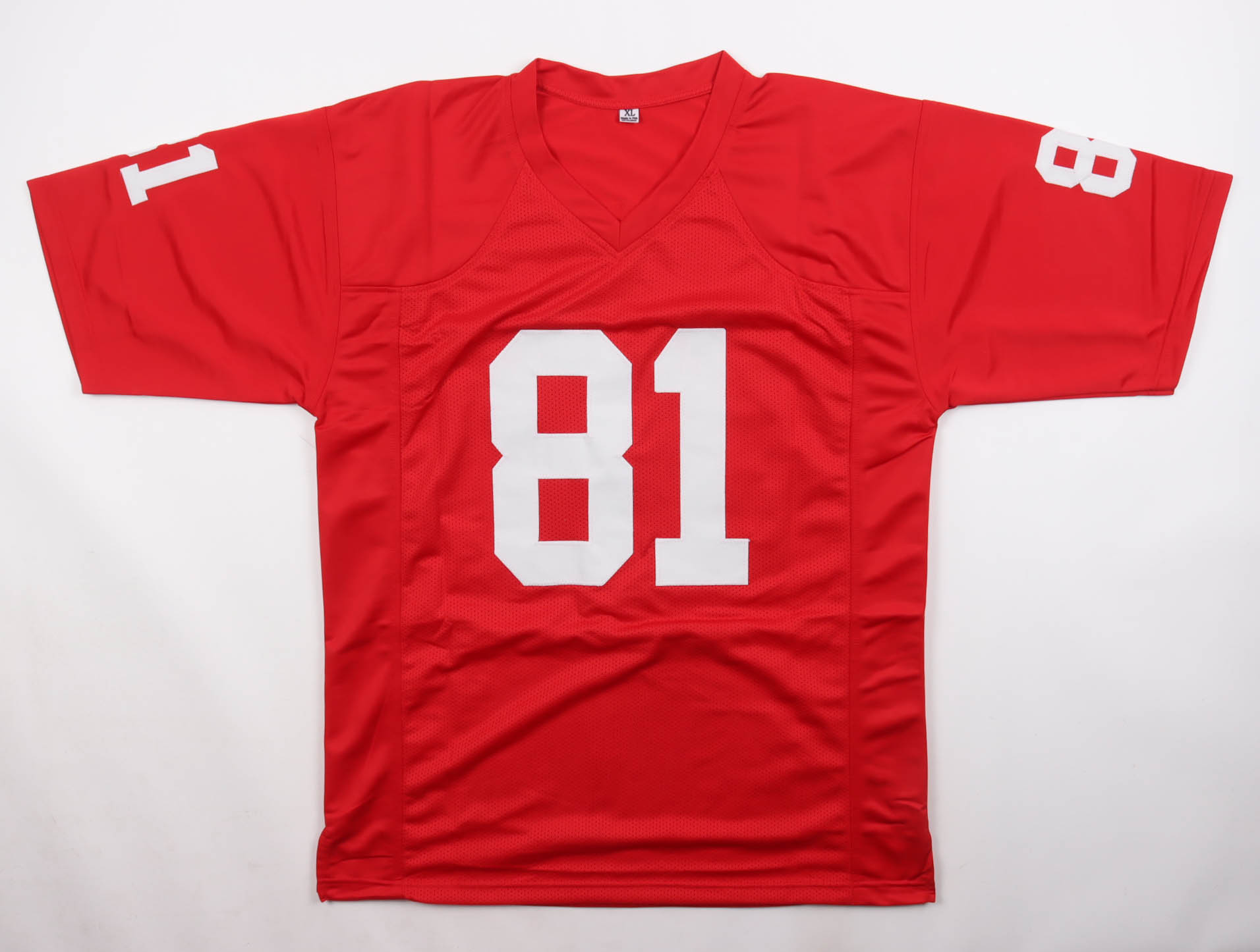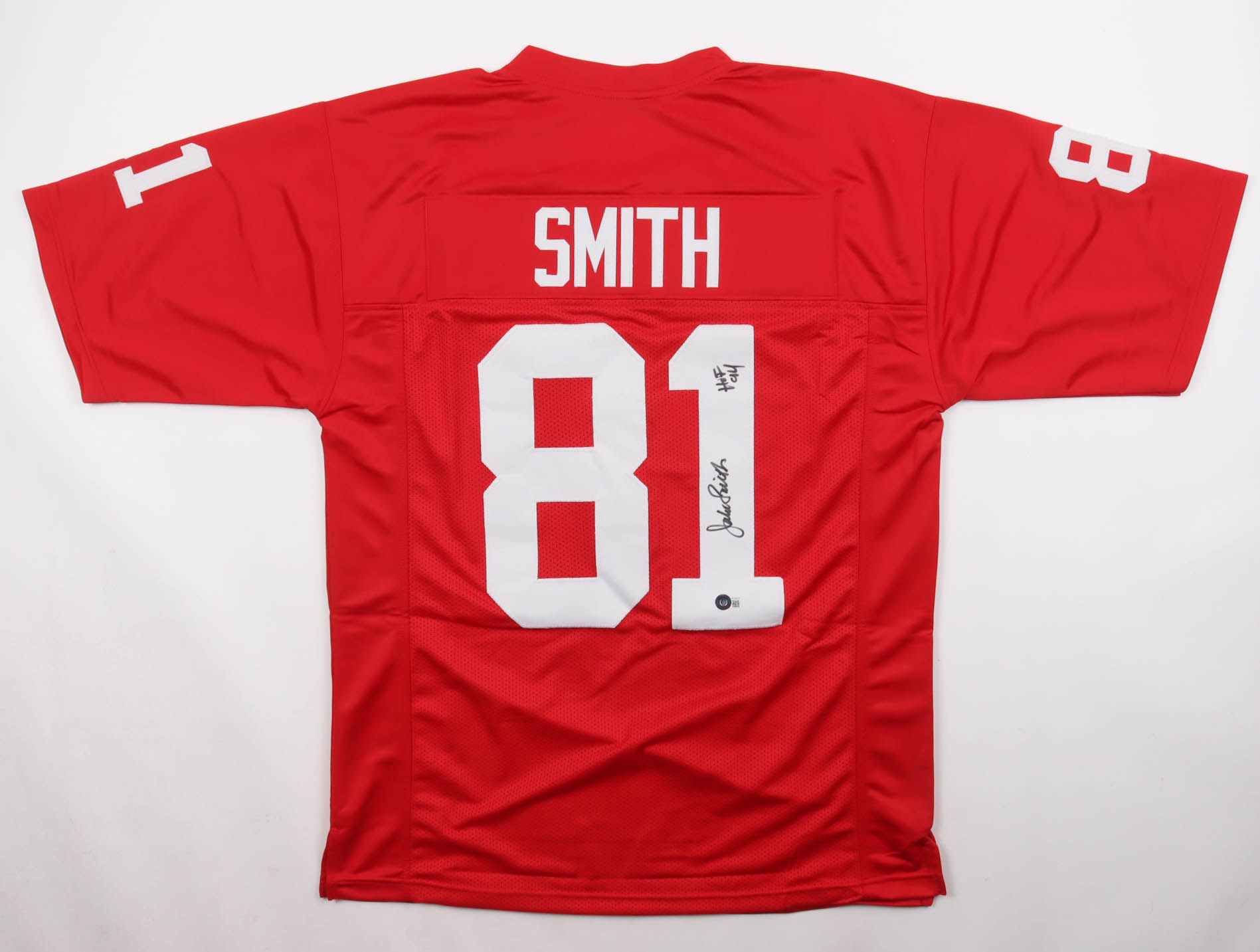 Custom jersey with everything sewn on, size XL. Hand-signed and inscribed by Jackie Smith (HOF).