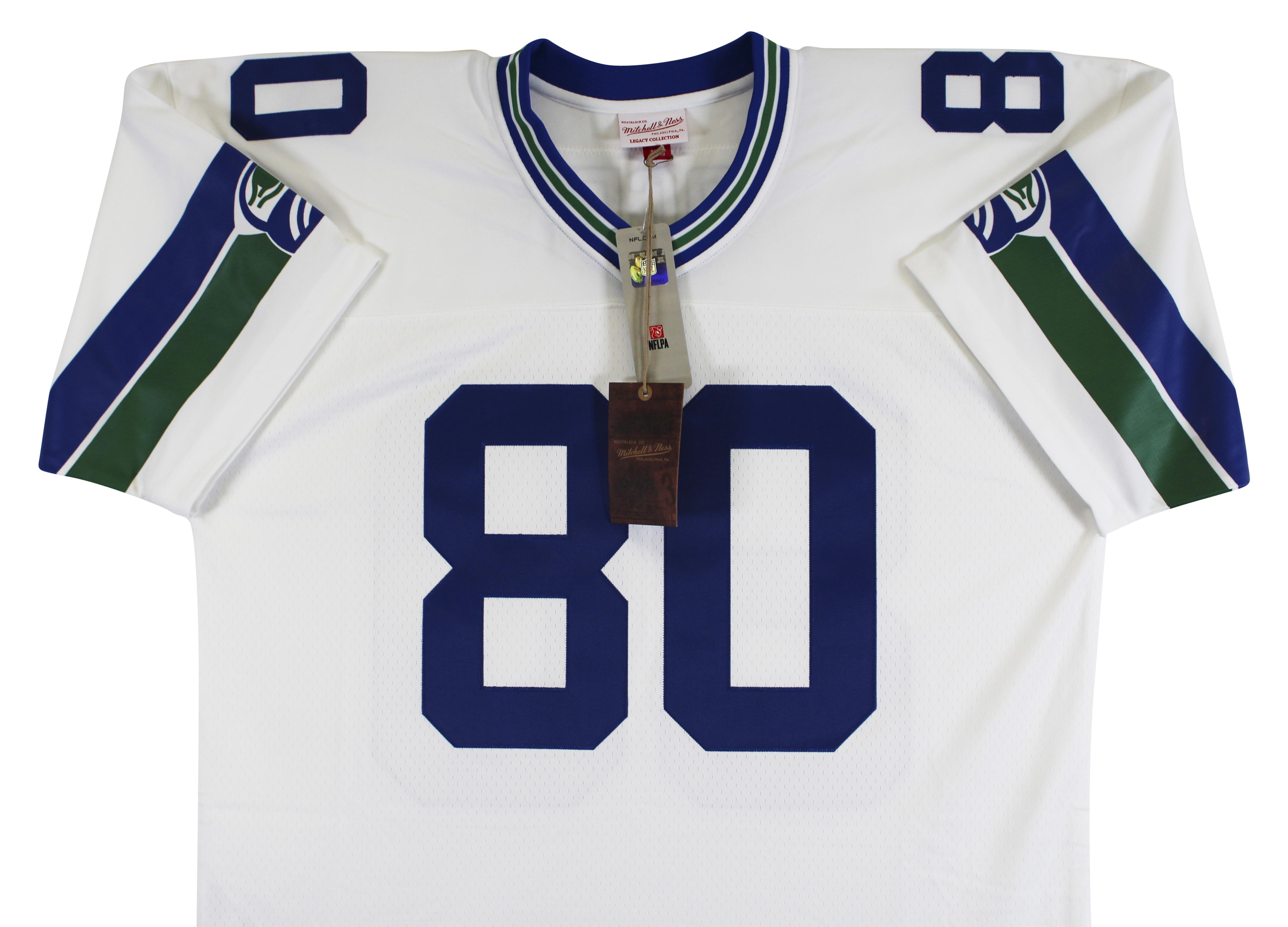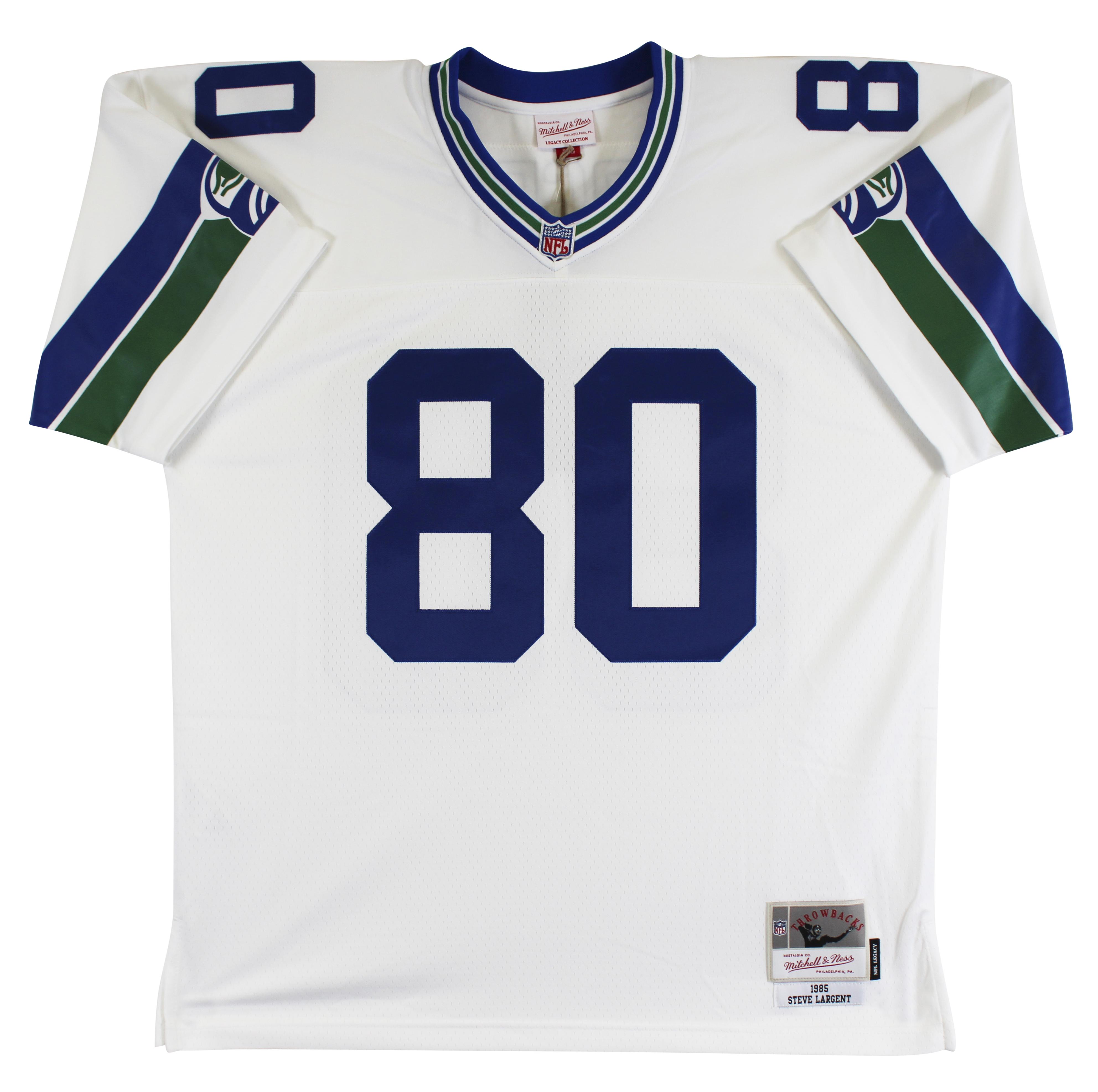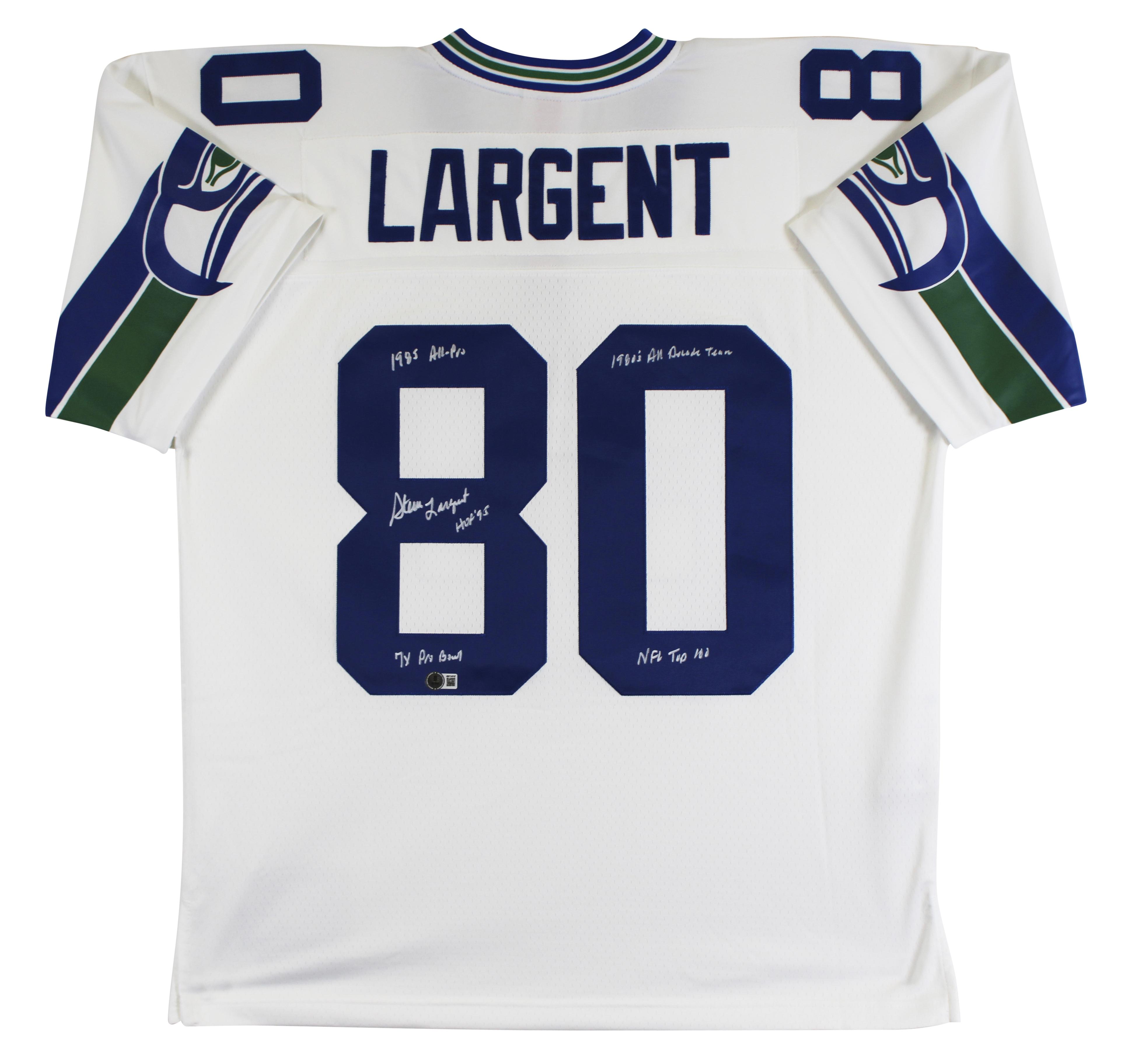 Mitchell & Ness jersey with everything sewn on, size XL. Hand-signed and inscribed by Steve Largent (Seattle Seahawks, HOF).