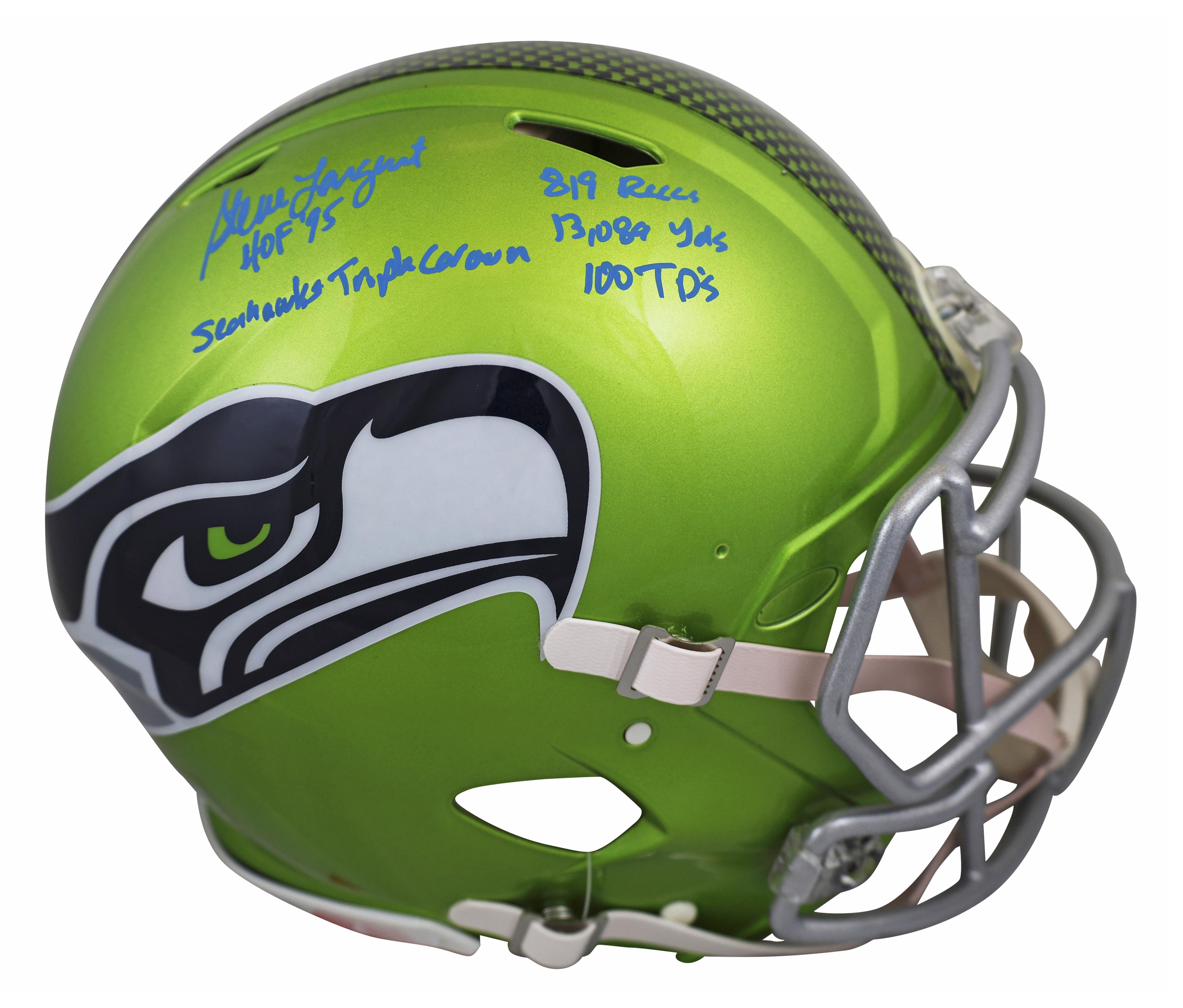 Steve Largent Signed Seahawks Full-Size Authentic On-Field Flash Alternate Speed Helmet with (5) Career Inscriptions & Display Case (Beckett)
