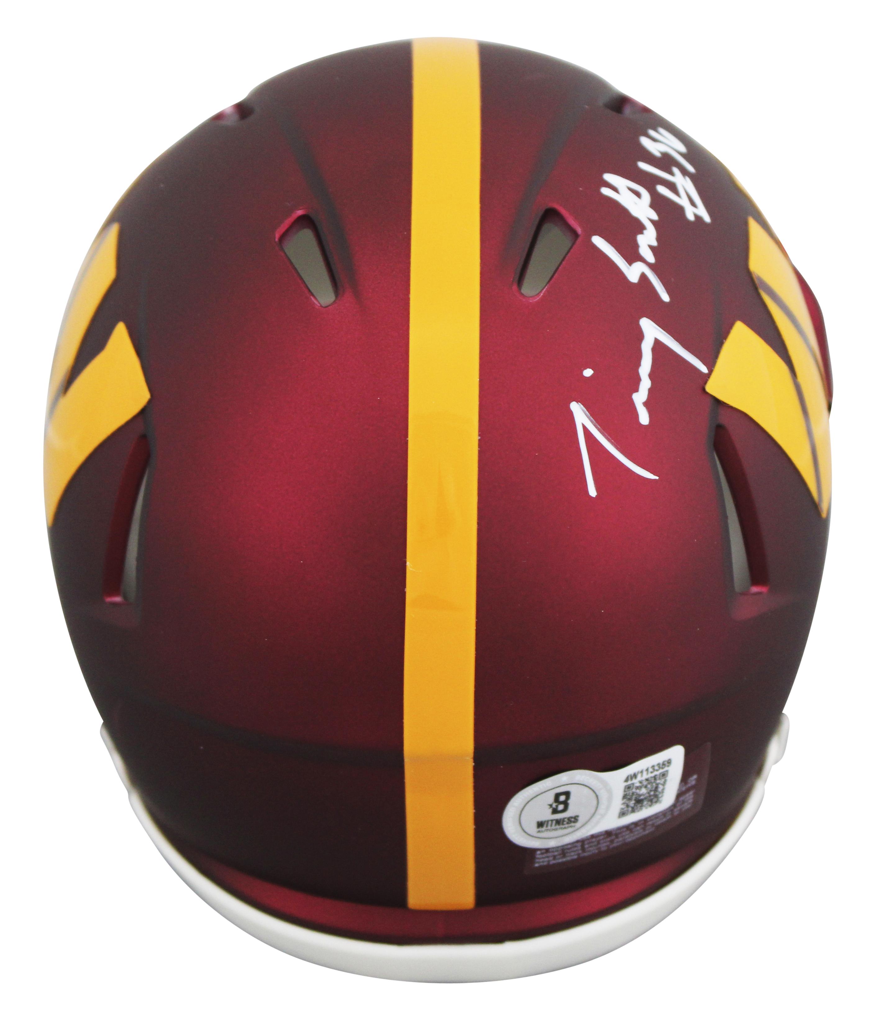 Riddell Washington Commanders speed mini helmet has been hand-signed and inscribed by Timmy Smith. Display case is included as shown.