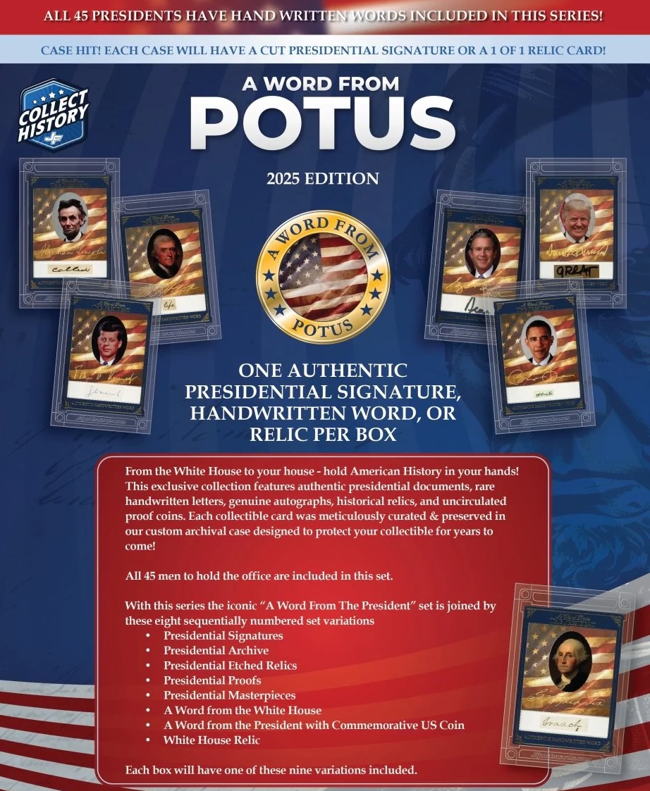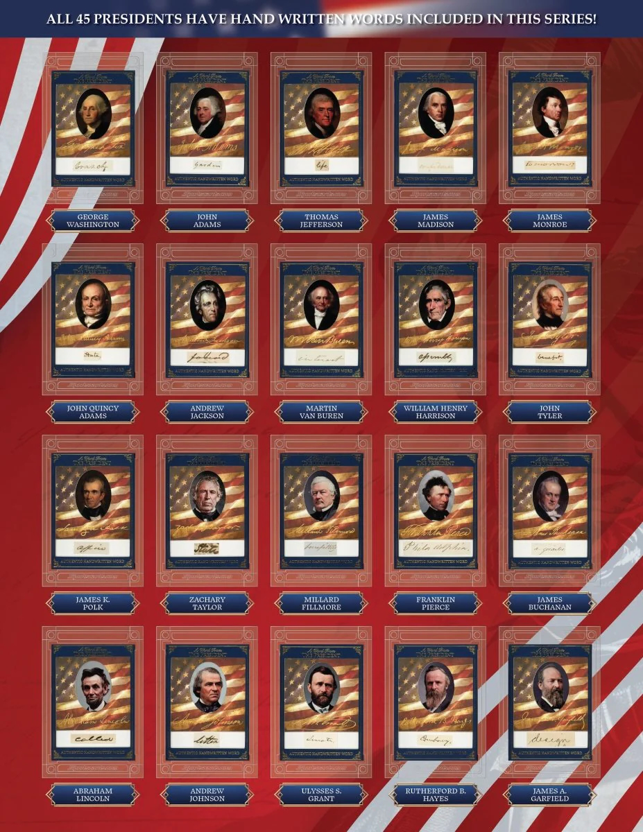ALL 45 Men to hold the Office of the President have hand written memorabilia, relics and cut signatures included in this set. From the White House to your house - hold American History in your hands! This exclusive collection features authentic presidential documents, rare handwritten letters, genuine autographs, historical relics, and uncirculated proof coins. The card designs are original to this set, created with care and respect for each office holder. Each collectible card was meticulously curated & preserved in our custom archival case designed to protect your collectible for years to come! Many, if not all, of the cards from the A Word from the President series become true 1 of 1's as each is a uniquely handwritten word by one of our Presidents.