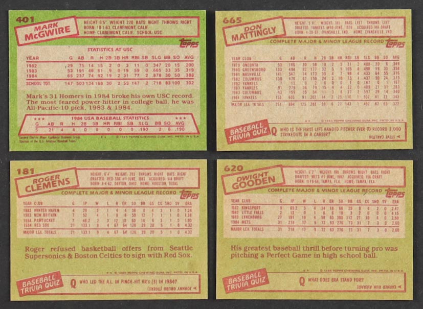 1985 Topps Baseball Complete Set of (792) Cards with Mark McGwire #401 RC, Don Mattingly #665, Roger Clemens #181 RC, Dwight Gooden #620