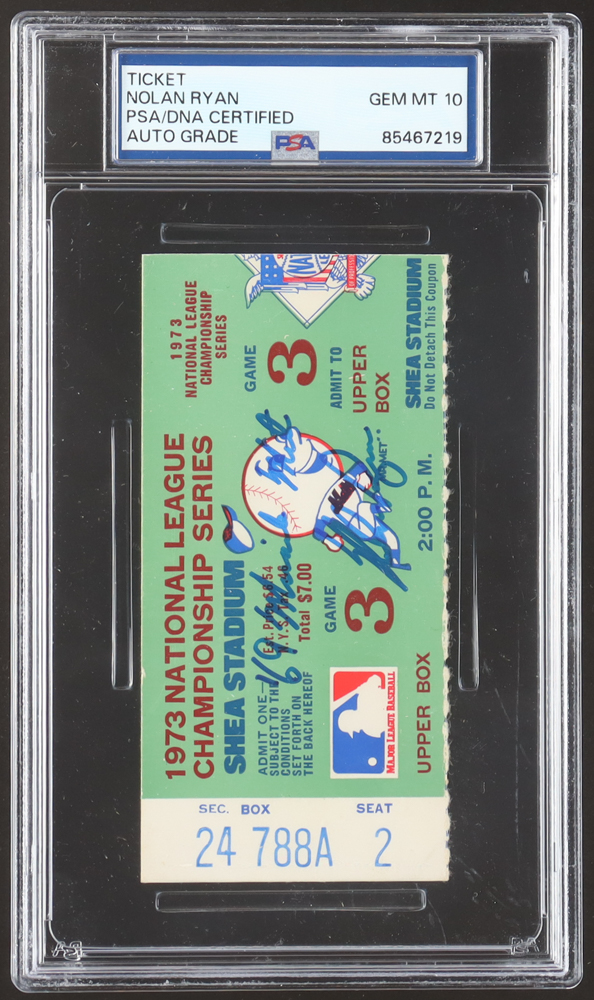 Nolan Ryan Signed 1973 Shea Stadium N.L. Championship Game 3 Ticket Inscribed "'69 Miracle Mets" (PSA | Autograph Grade PSA 10)