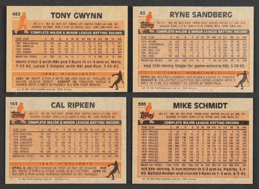 1983 Topps Baseball Complete Factory Set of (792) Cards with Tony Gwynn #482 RC, Ryne Sandberg #83 RC, Mike Schmidt #300, Cal Ripken Jr #163