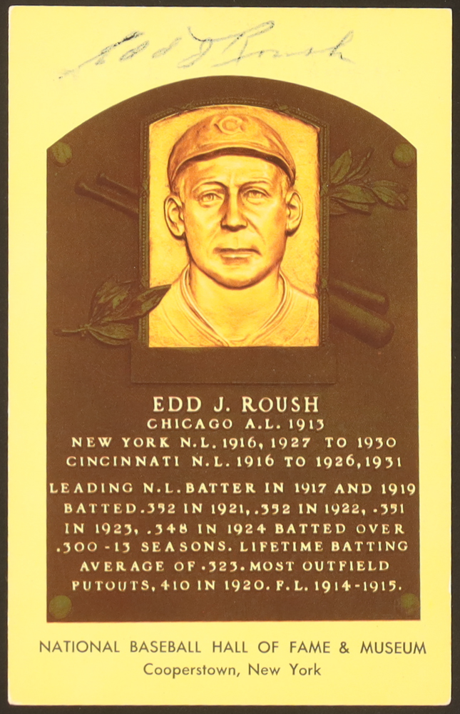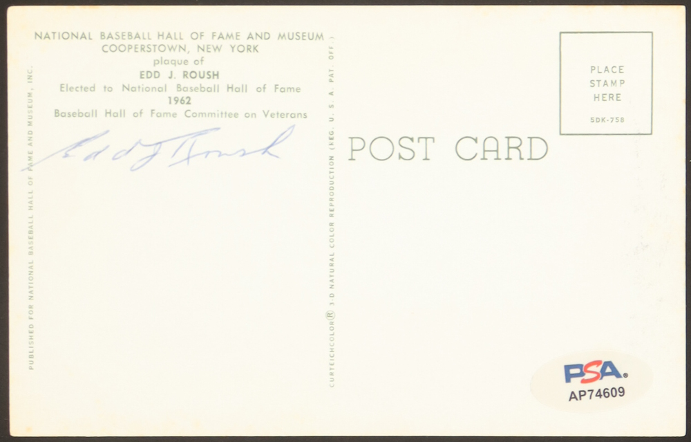 Edd Roush Twice-Signed Hall of Fame Plaque Postcard (PSA)