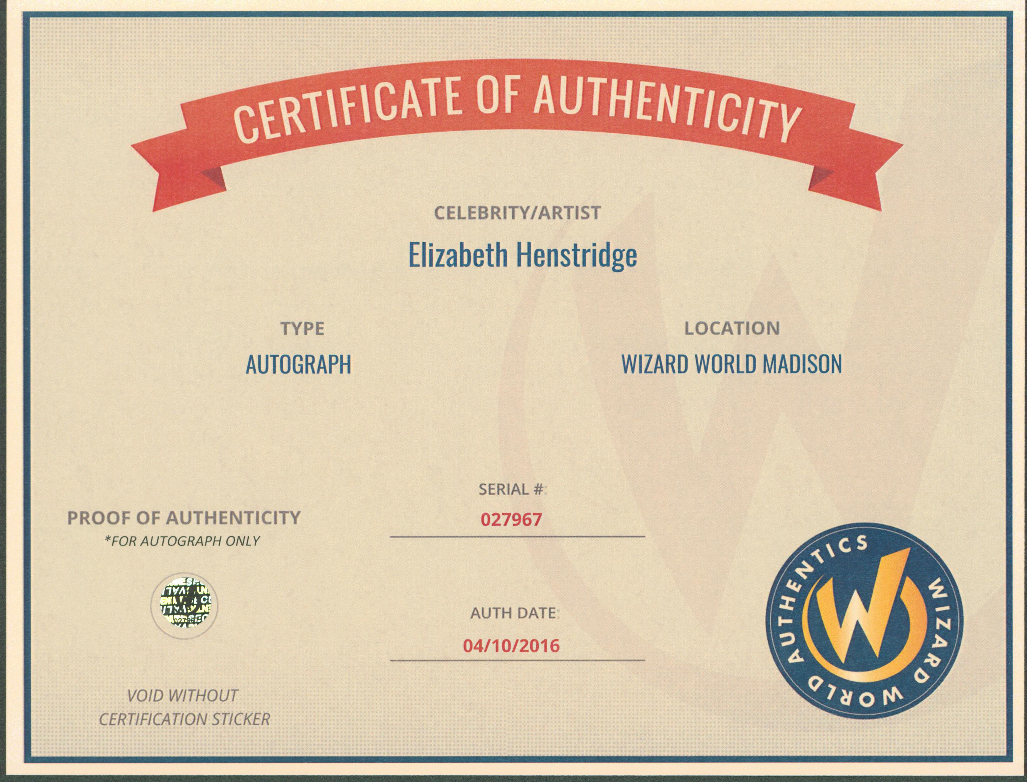 Photo measures approximately 8" x 10" in size. Hand-signed by Elizabeth Henstridge.