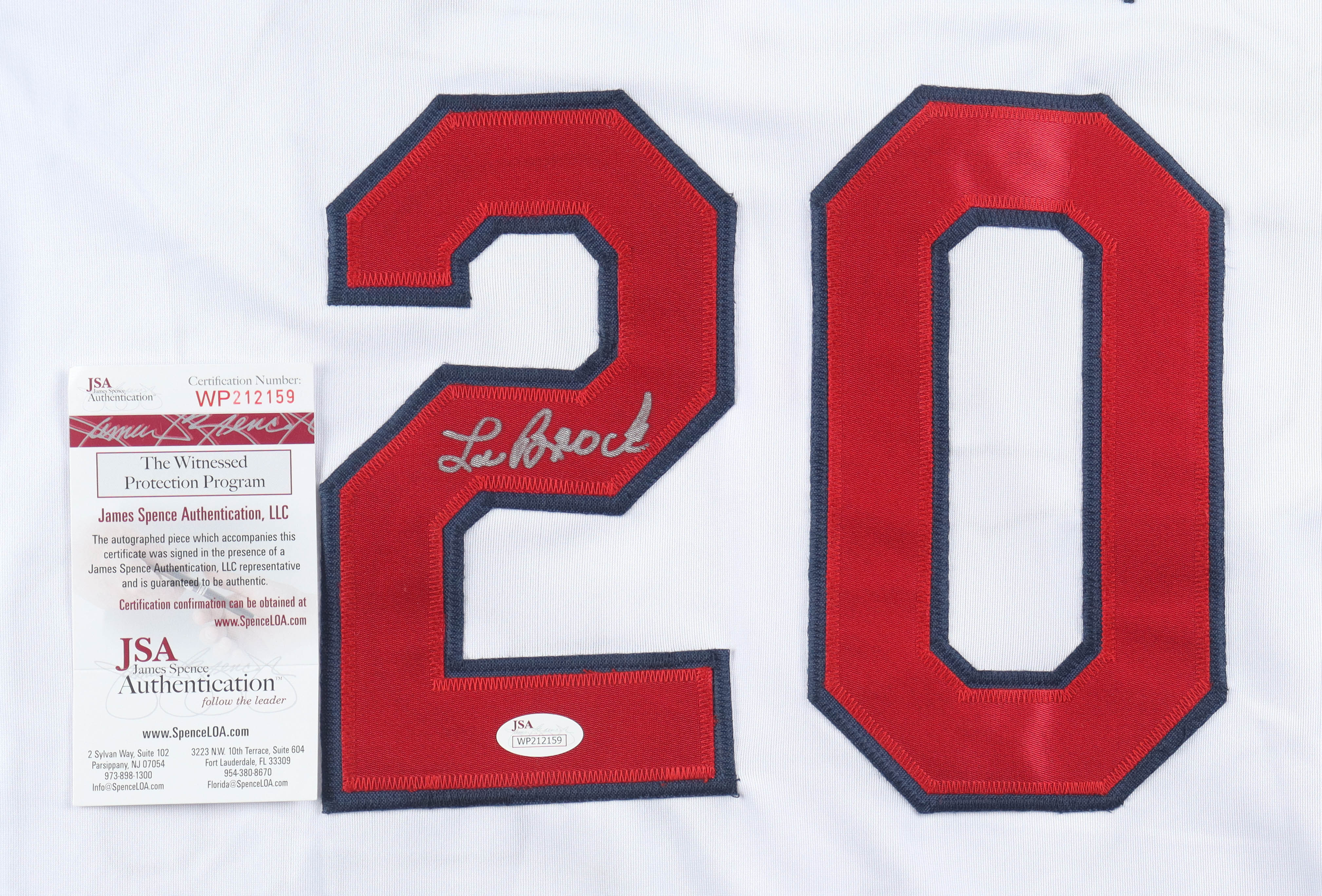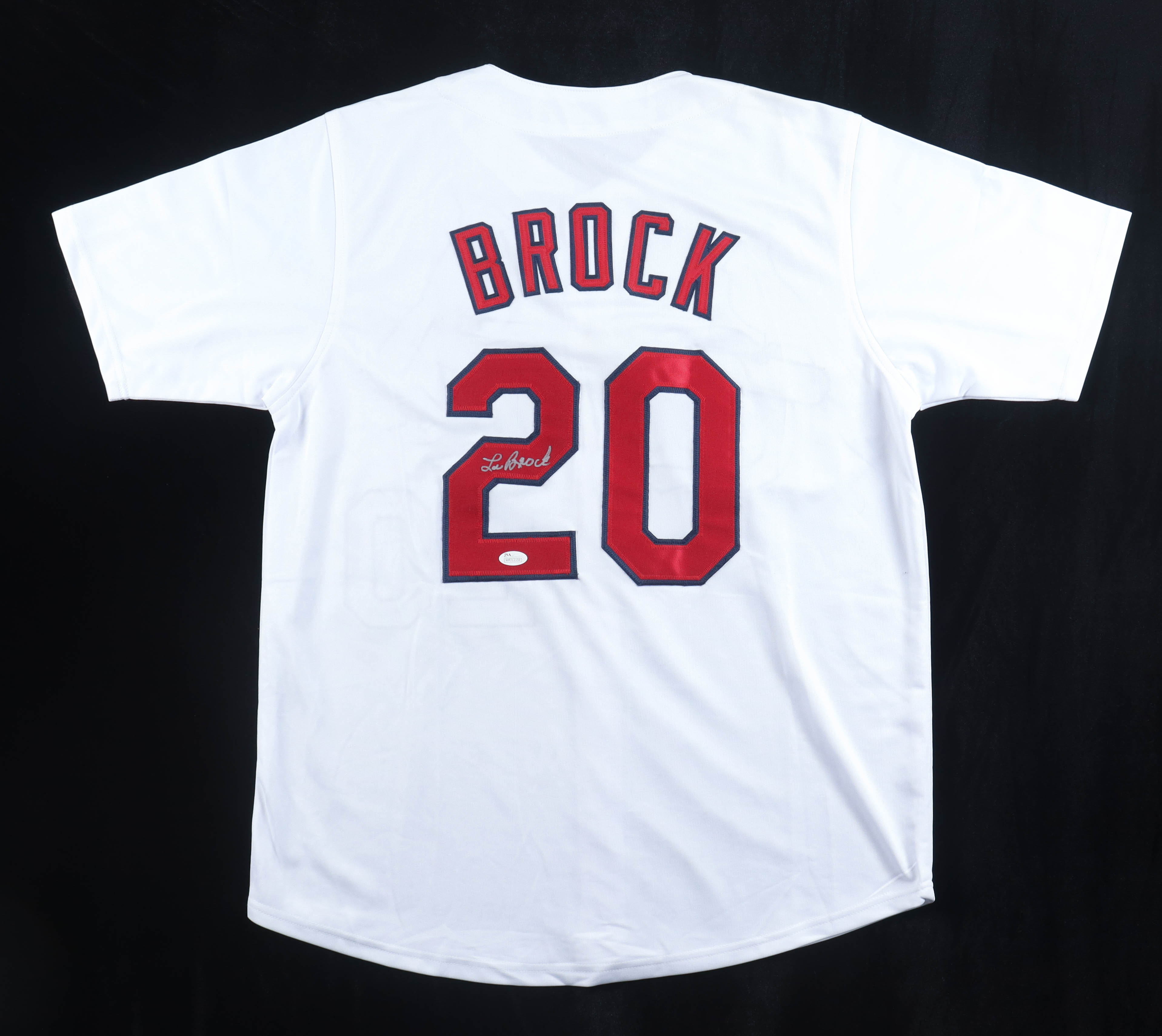 Custom jersey with everything sewn on, size XL. Hand-signed by Lou Brock (D. 2020, St. Louis Cardinals, HOF).