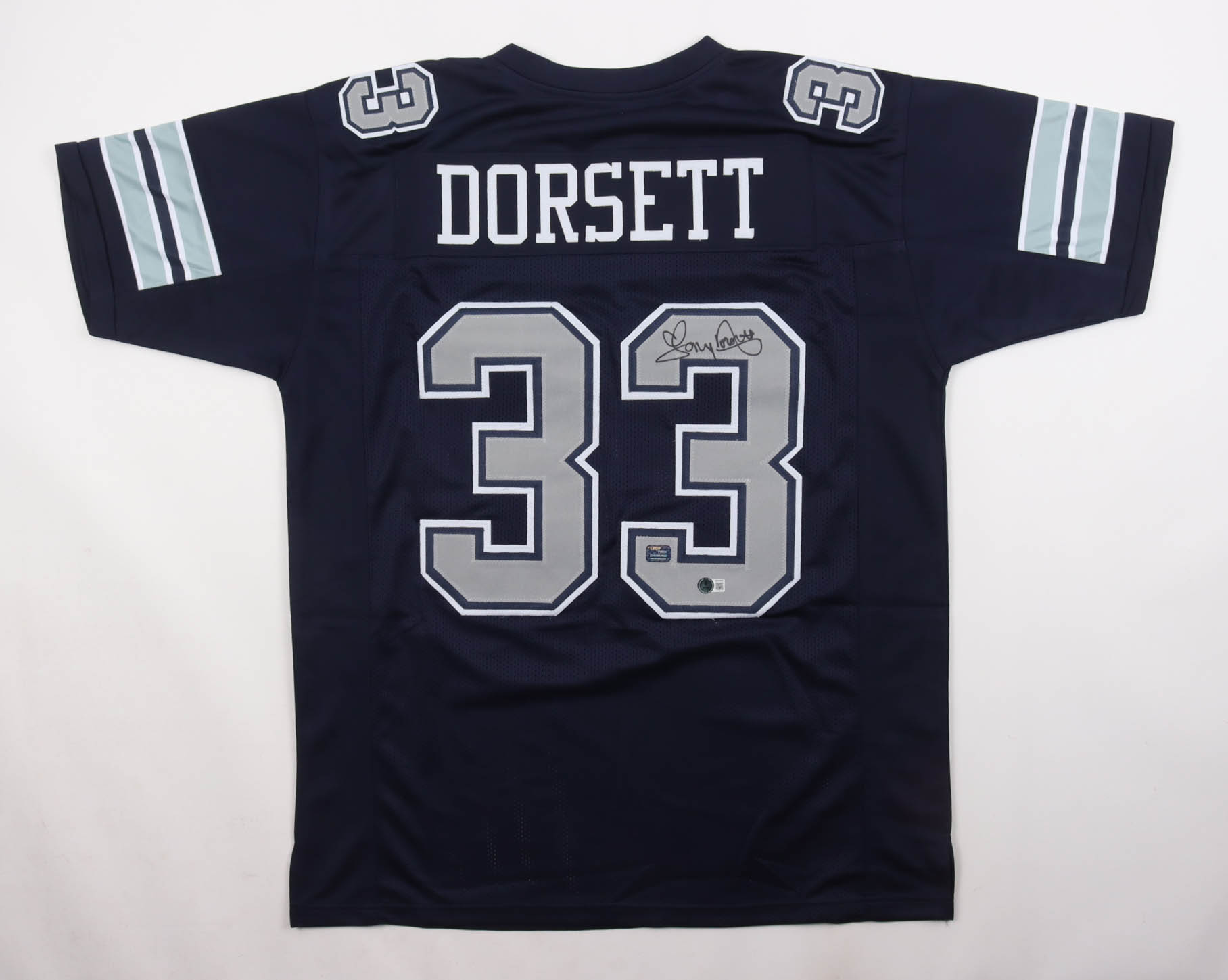 Custom jersey with everything sewn on, size XL. Hand-signed by Tony Dorsett (HOF). Please note, the signature has bled.