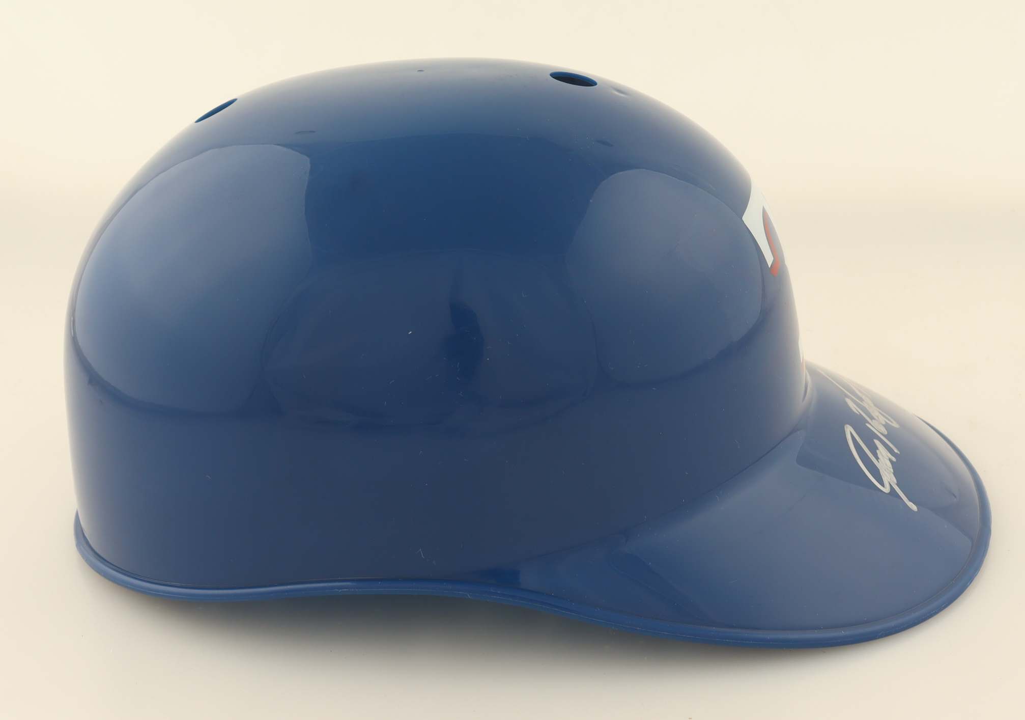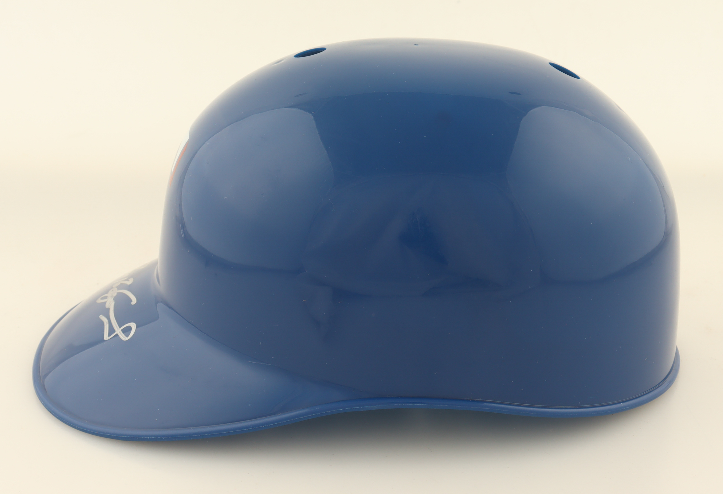 Texas Rangers replica plastic souvenir batting helmet. Hand-signed by Ivan Rodriguez.