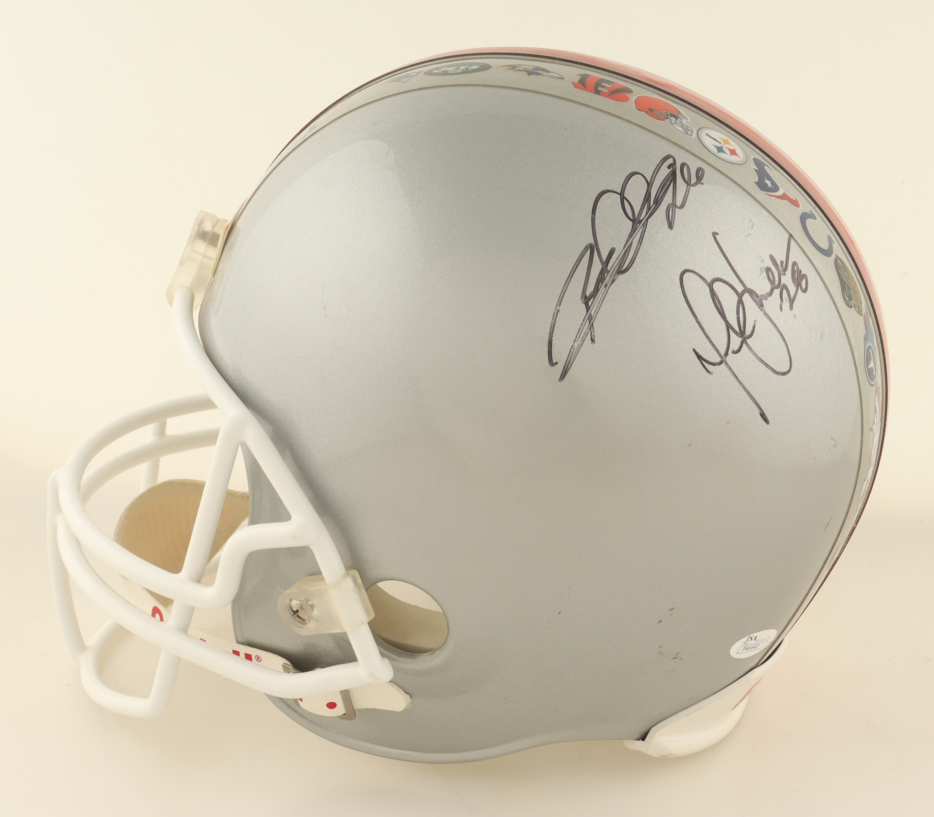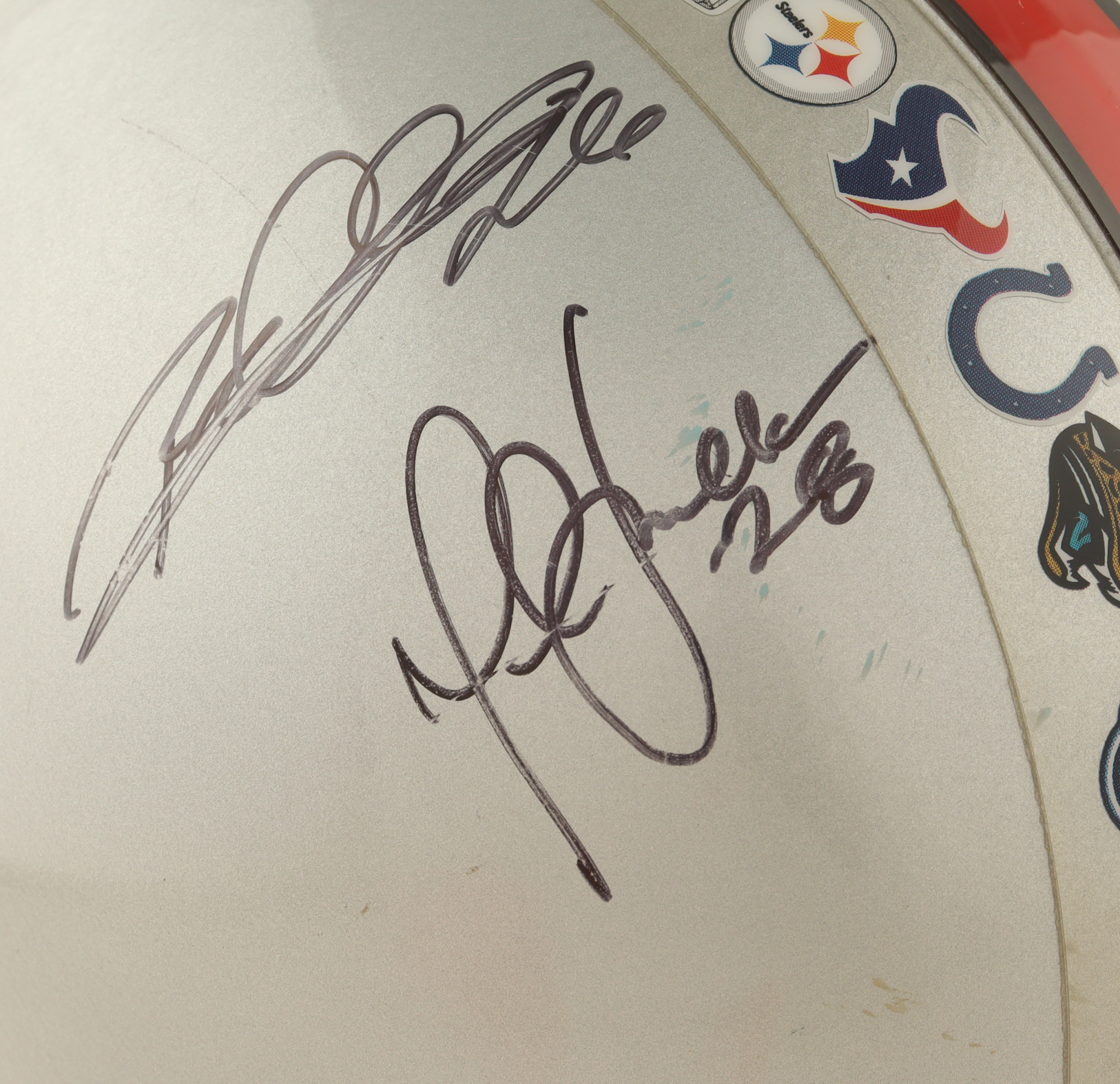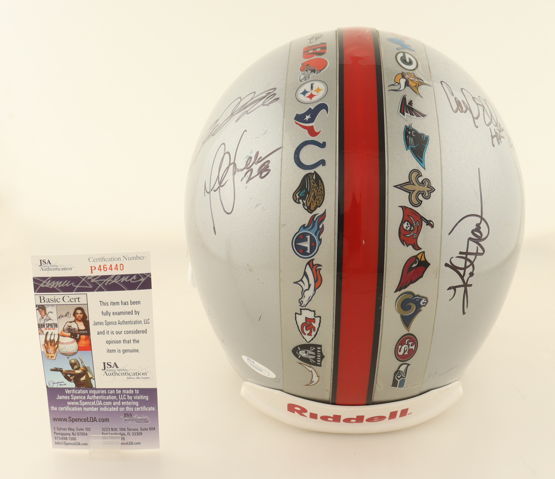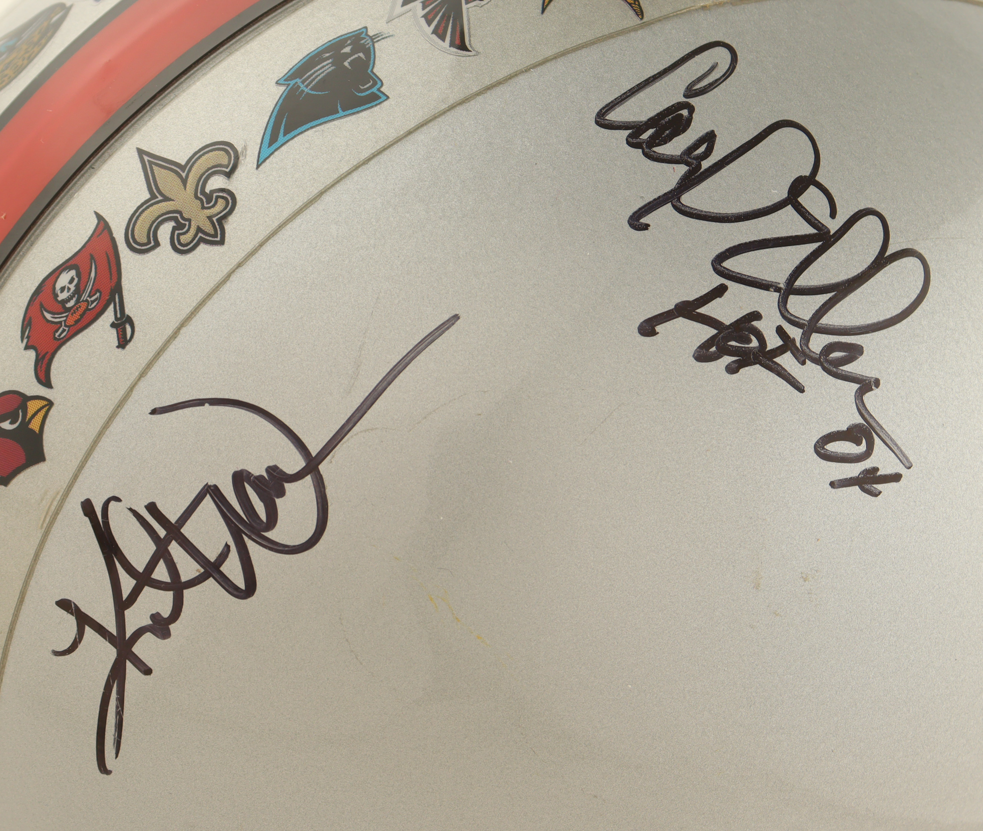 Riddell NFL Teams logo full-size replica helmet. Hand-signed by Kurt Warner, Marshall Faulk, Carl Eller, Carl Banks, and Rocky Bleier.