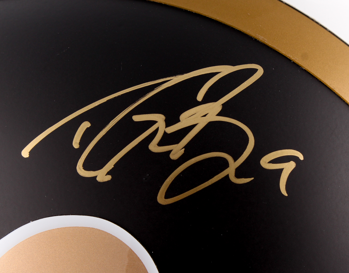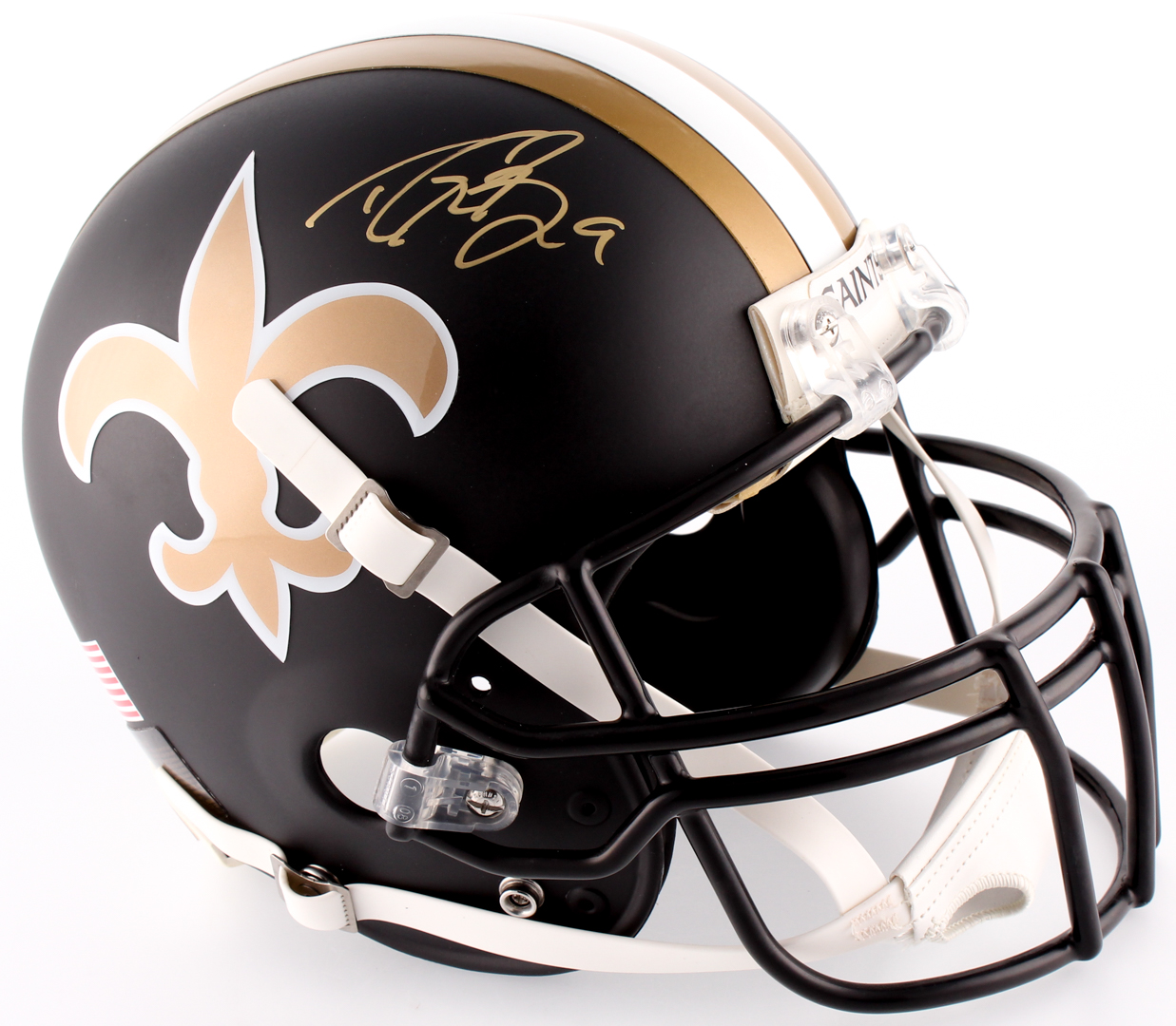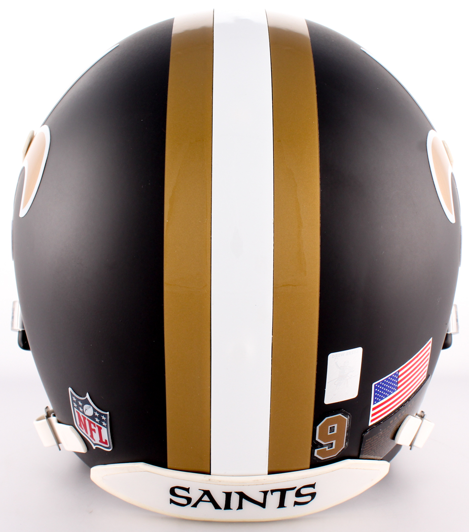 New Orleans Saints full-size authentic on-field helmet. Hand-signed in gold paint pen by Drew Brees (Chargers).