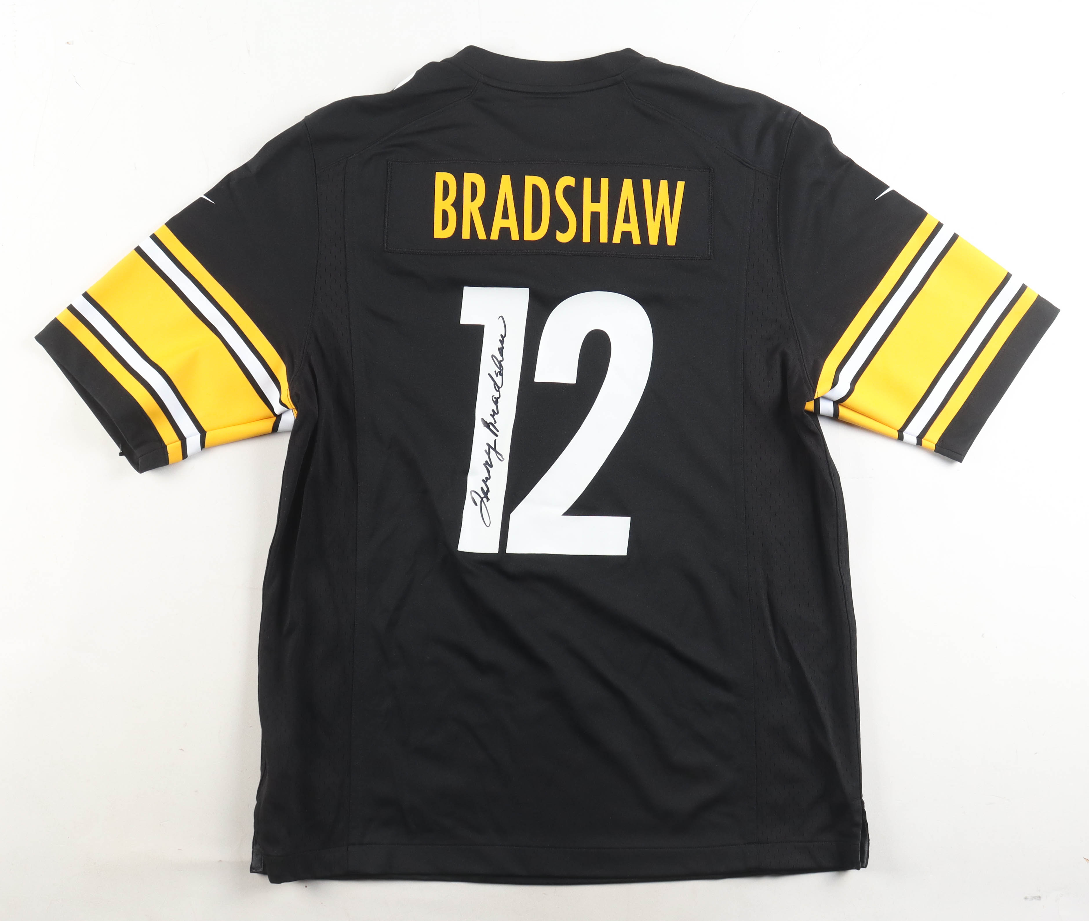 Nike jersey. Everything is sewn on, size L. Hand-signed by Terry Bradshaw (Pittsburgh Steelers, HOF).
