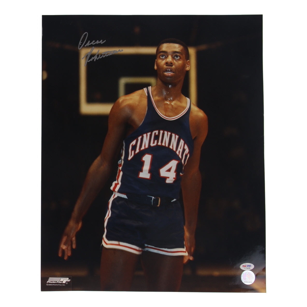 Photo measures approximately 16" x 20" in size. Hand-signed by Oscar Robertson (Cincinnati Royals, HOF). Please note, there are creases throughout the photo.