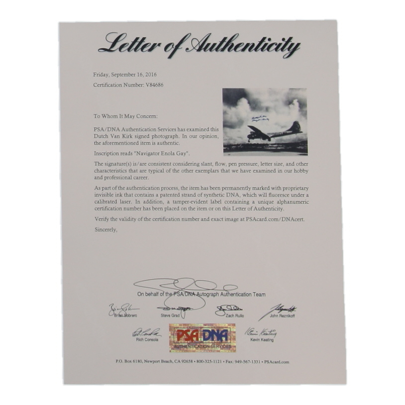 Photo measures 16" x 20" in size and has been hand-signed and inscribed by Theodore "Dutch" Van Kirk (D. 2014).