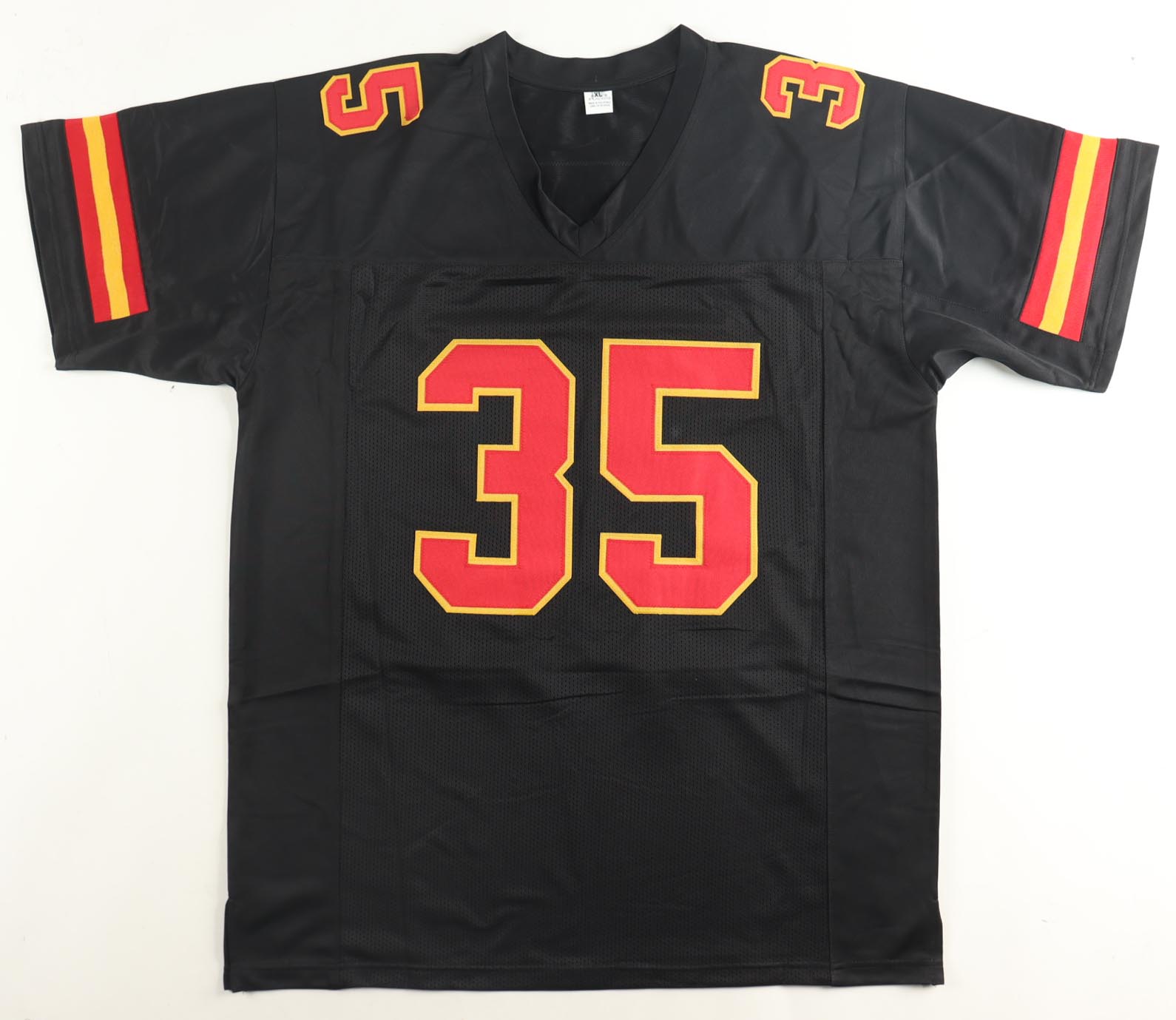 Custom jersey. Everything is sewn on, size XL. Hand-signed by Christian Okoye.