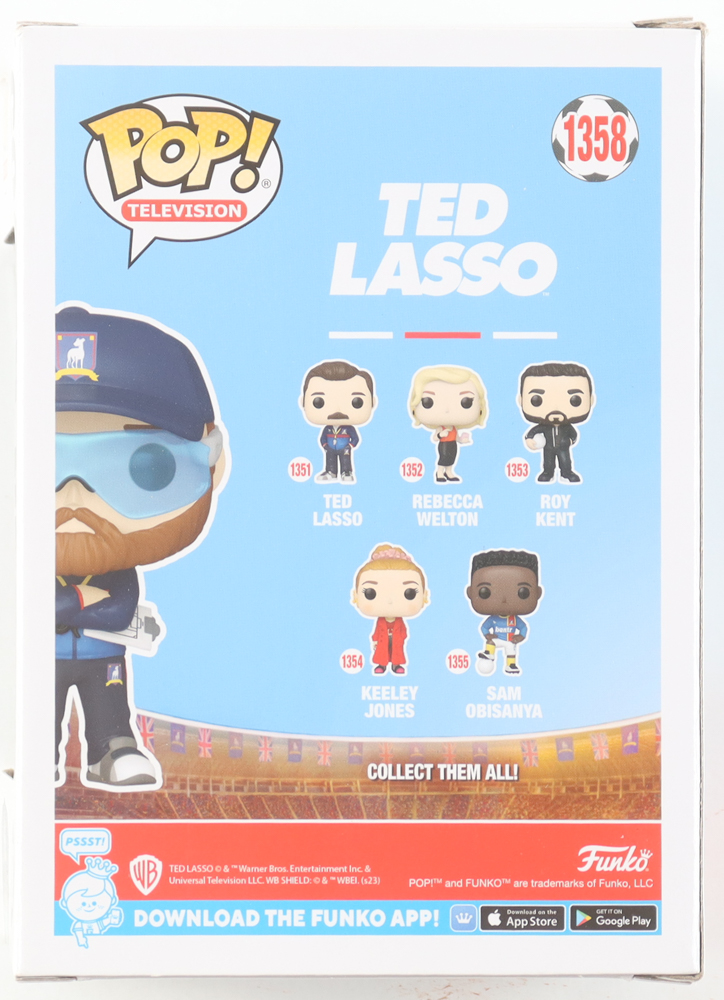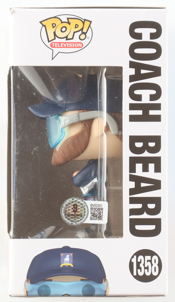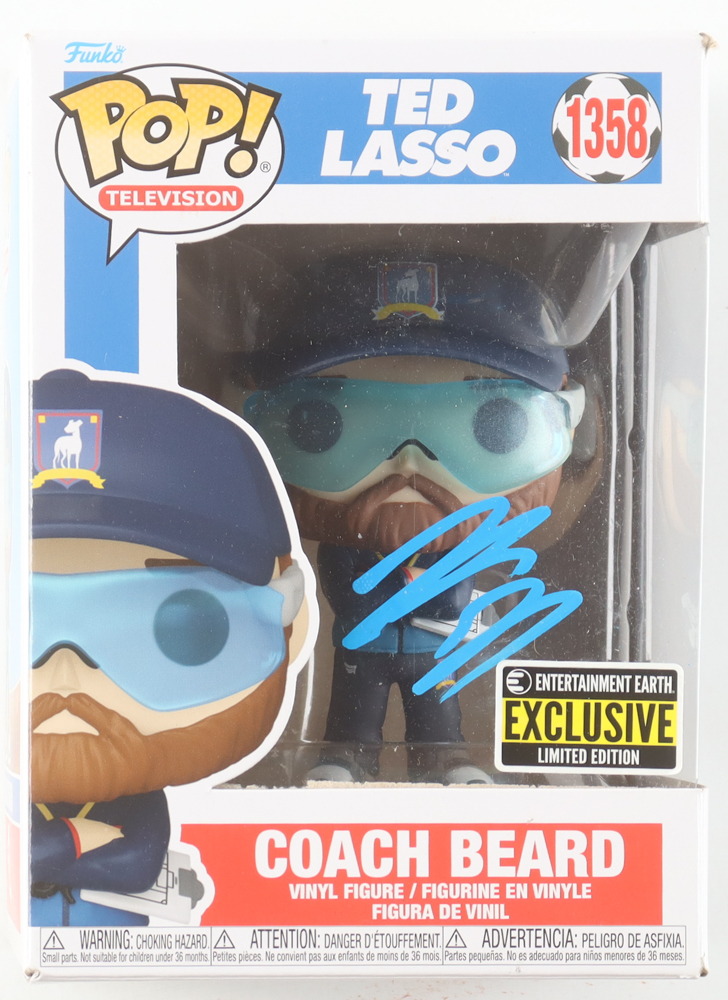 Vinyl figure measures approximately 4" tall and comes in original packaging. Hand-signed on the box by Brendan Hunt (Coach Willis Beard). Please note, the window has been swapped. See photos for more details.