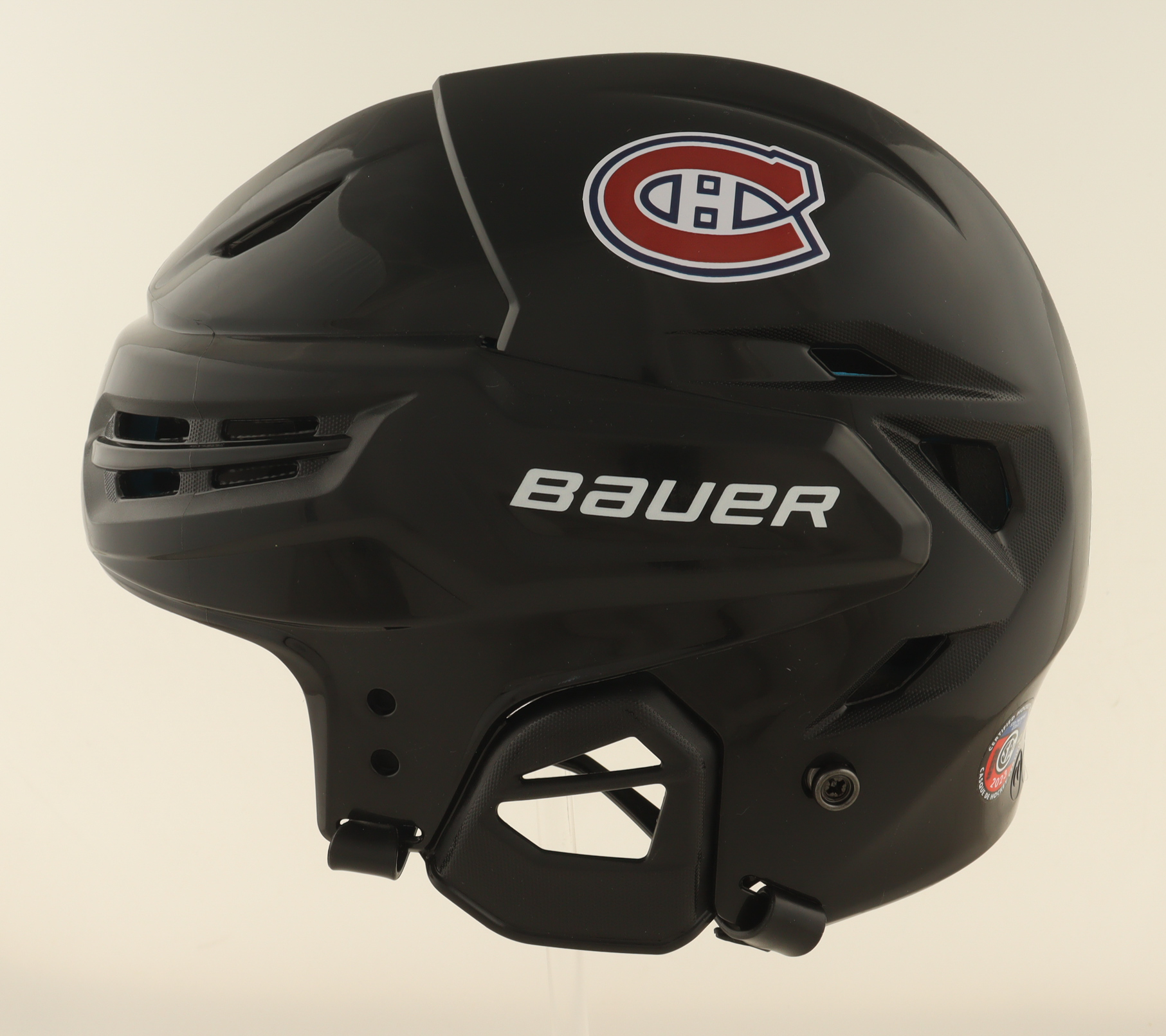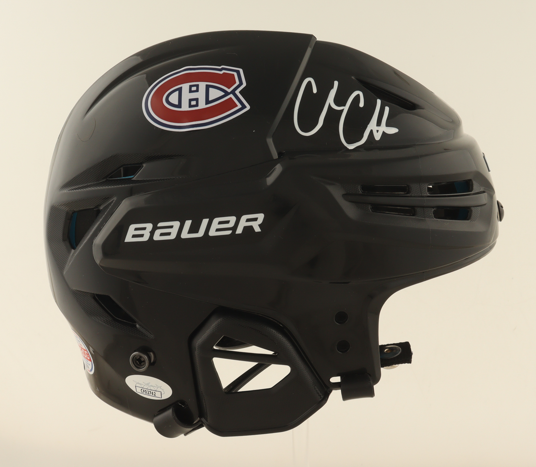Bauer Montreal Canadiens Full-Size Authentic On-Ice helmet has been hand-signed by Cole Caufield.