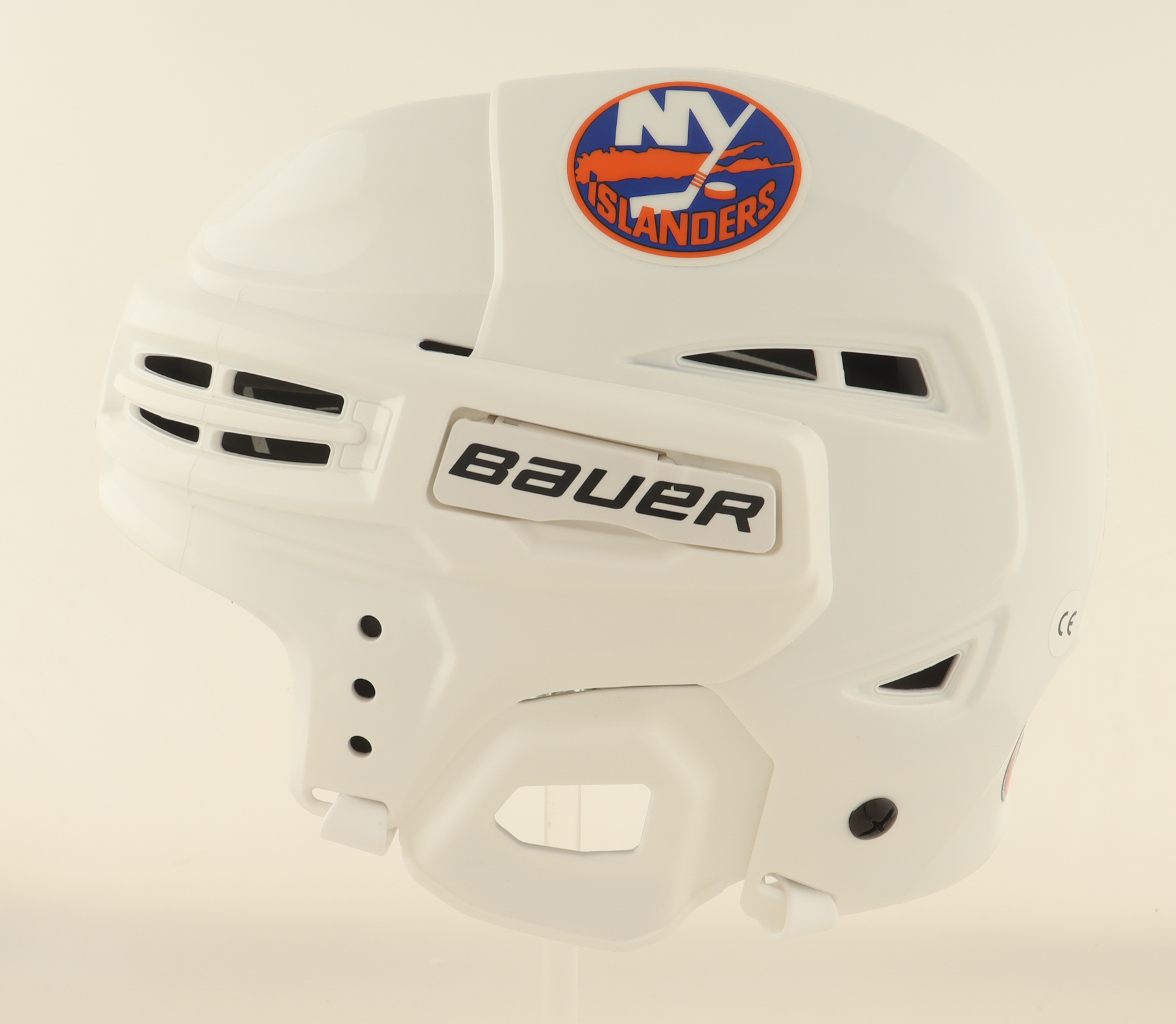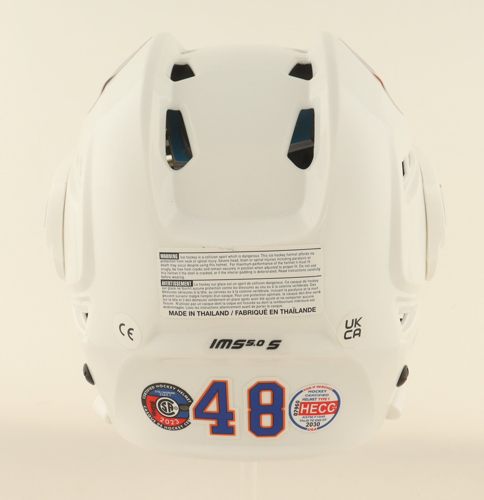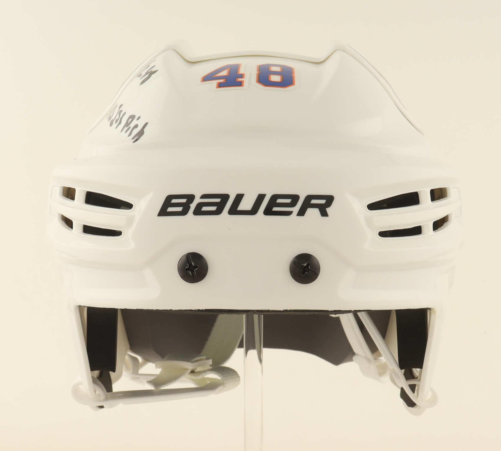 Bauer New York Islanders full-size helmet. Hand-signed and inscribed by Matthew Schaefer.