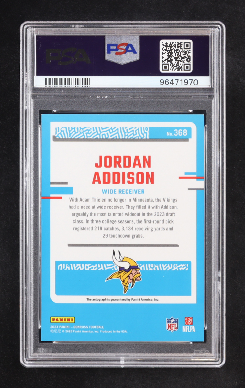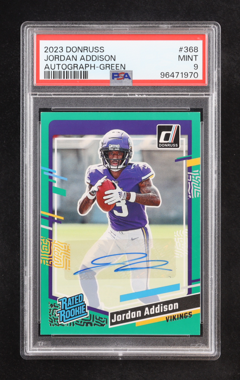 Jordan Addison 2023 Donruss Rated Rookies Autographs Green #368 RC (PSA 9)