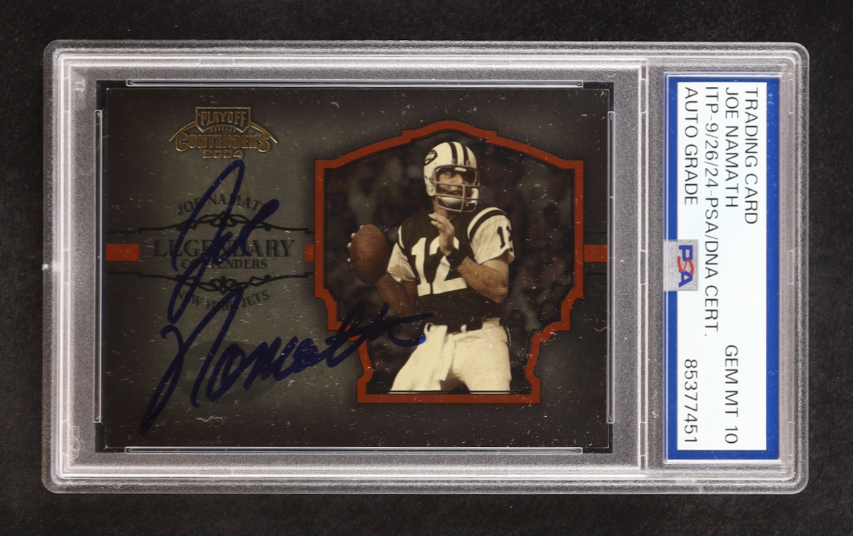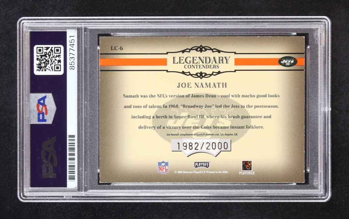 Joe Namath Signed 2004 Donruss Playoff Legendary Contenders #LC-6 #1982/2000 (PSA | Autograph Graded PSA 10)