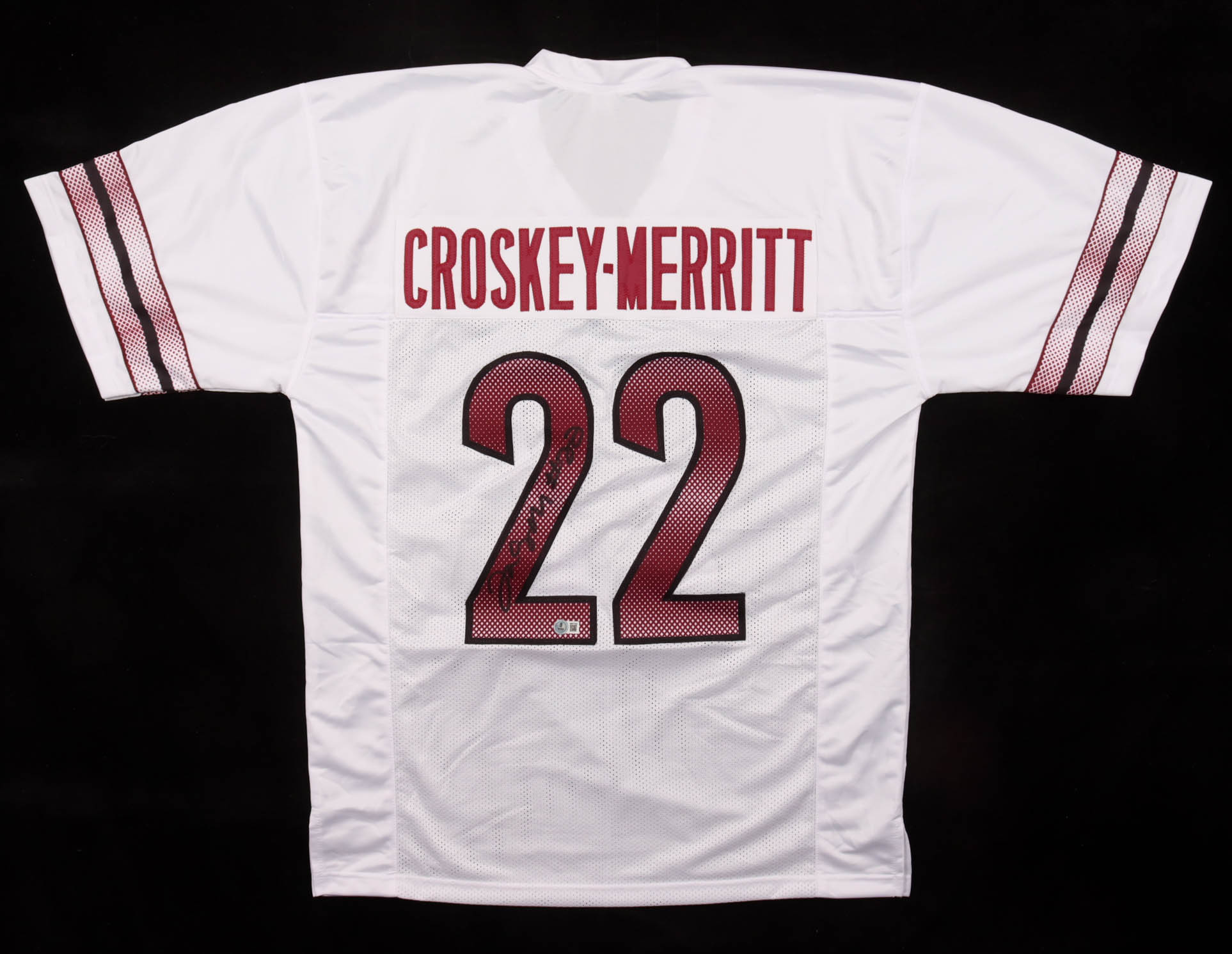 Custom jersey with everything sewn on, size XL. Hand-signed by Jacory Croskey-Merritt.