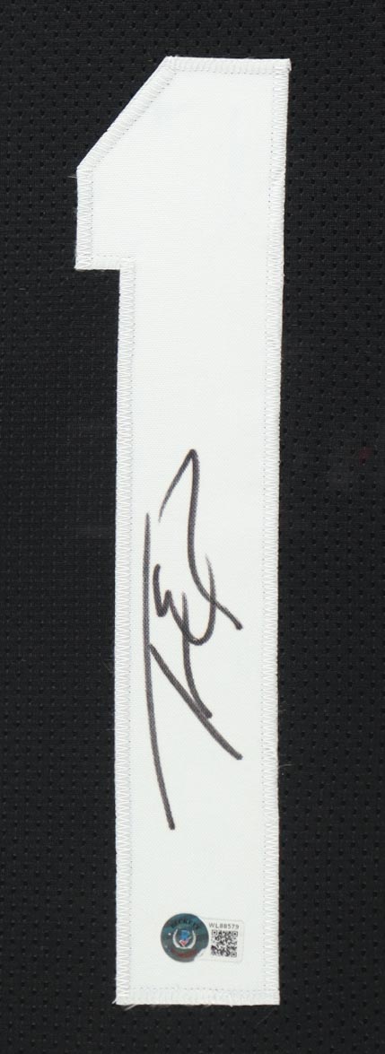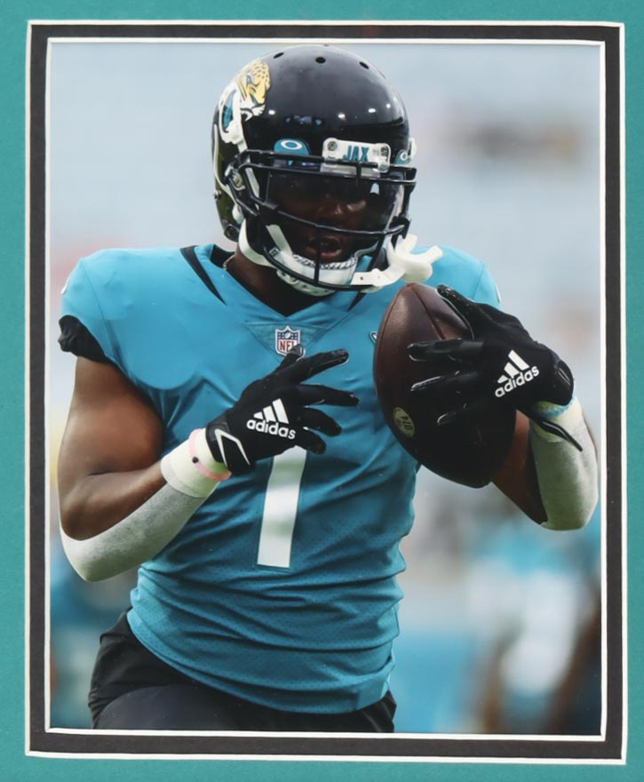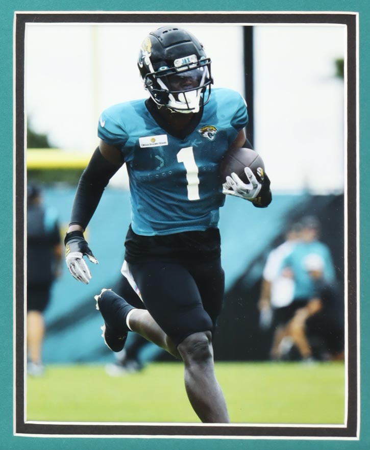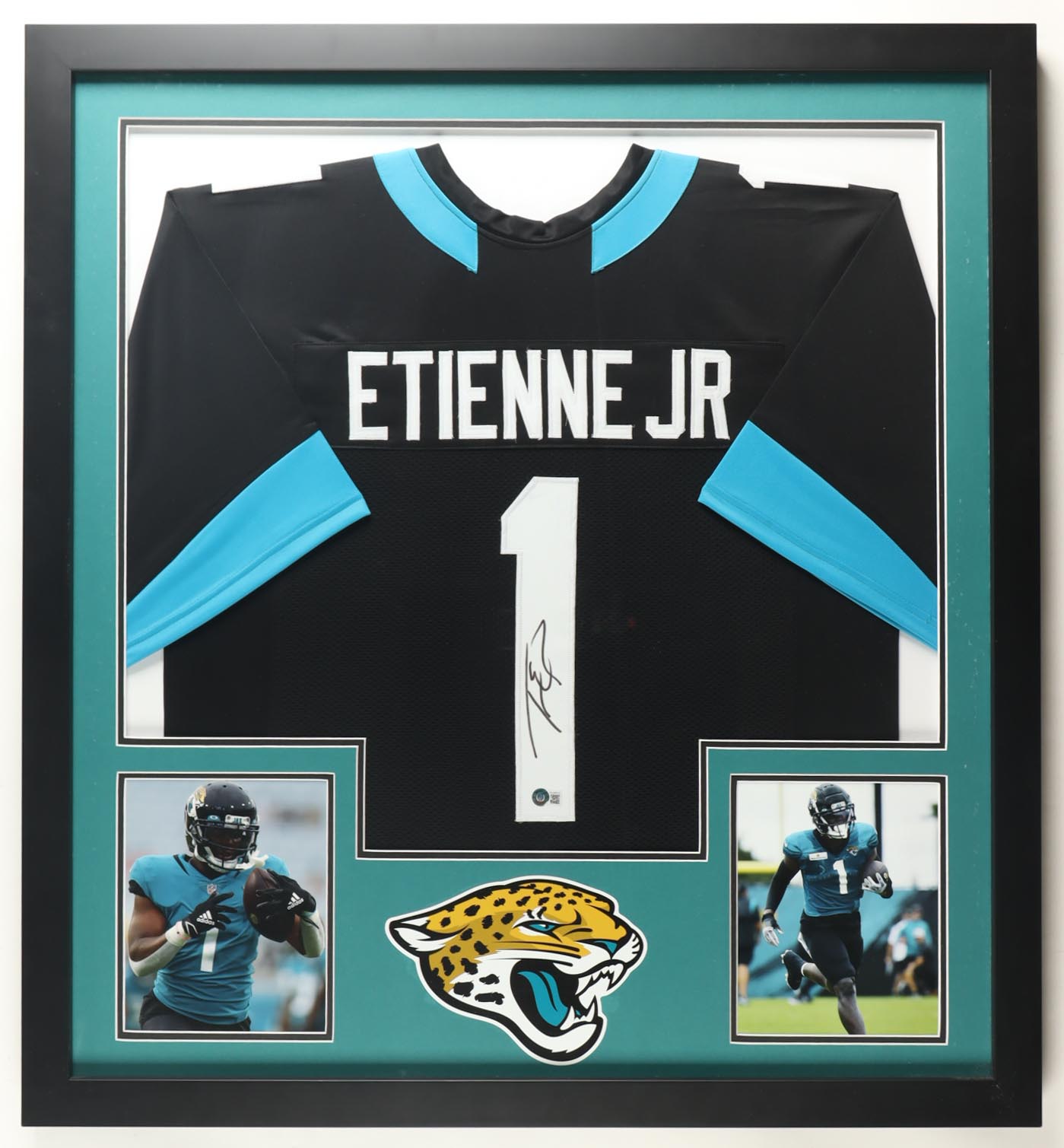 Custom frame measures 35" x 38" in size and features a jersey that has been hand-signed by Travis Etienne Jr.