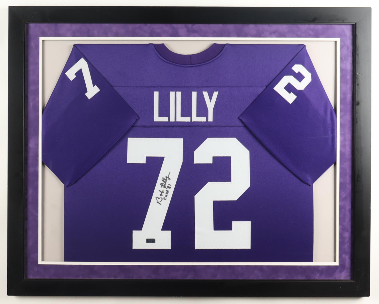 Custom frame measures approximately 31" x 39" in size and features a custom jersey that has been hand-signed and inscribed by Bob Lily (HOF).