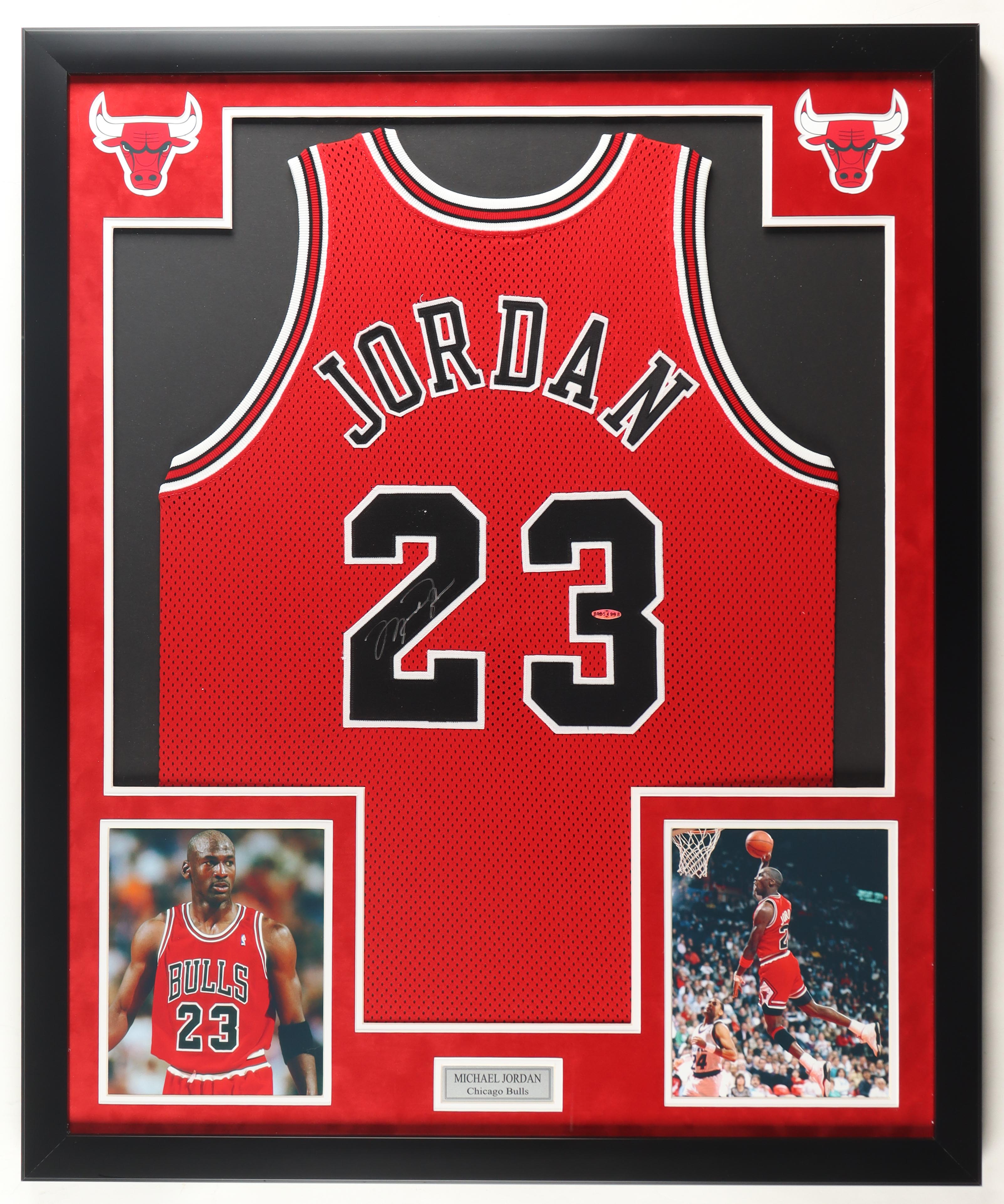 Custom frame measures 32.5" x 39.5" in size and features an authentic jersey that has been hand-signed by Bulls legend, Michael Jordan!