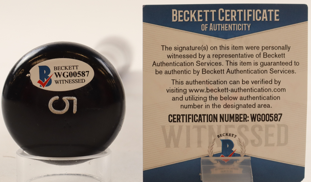 The autograph includes an official Beckett Authentication Services serially-numbered hologram and matching COA for authenticity purposes. The signing of this item was witnessed by Beckett.