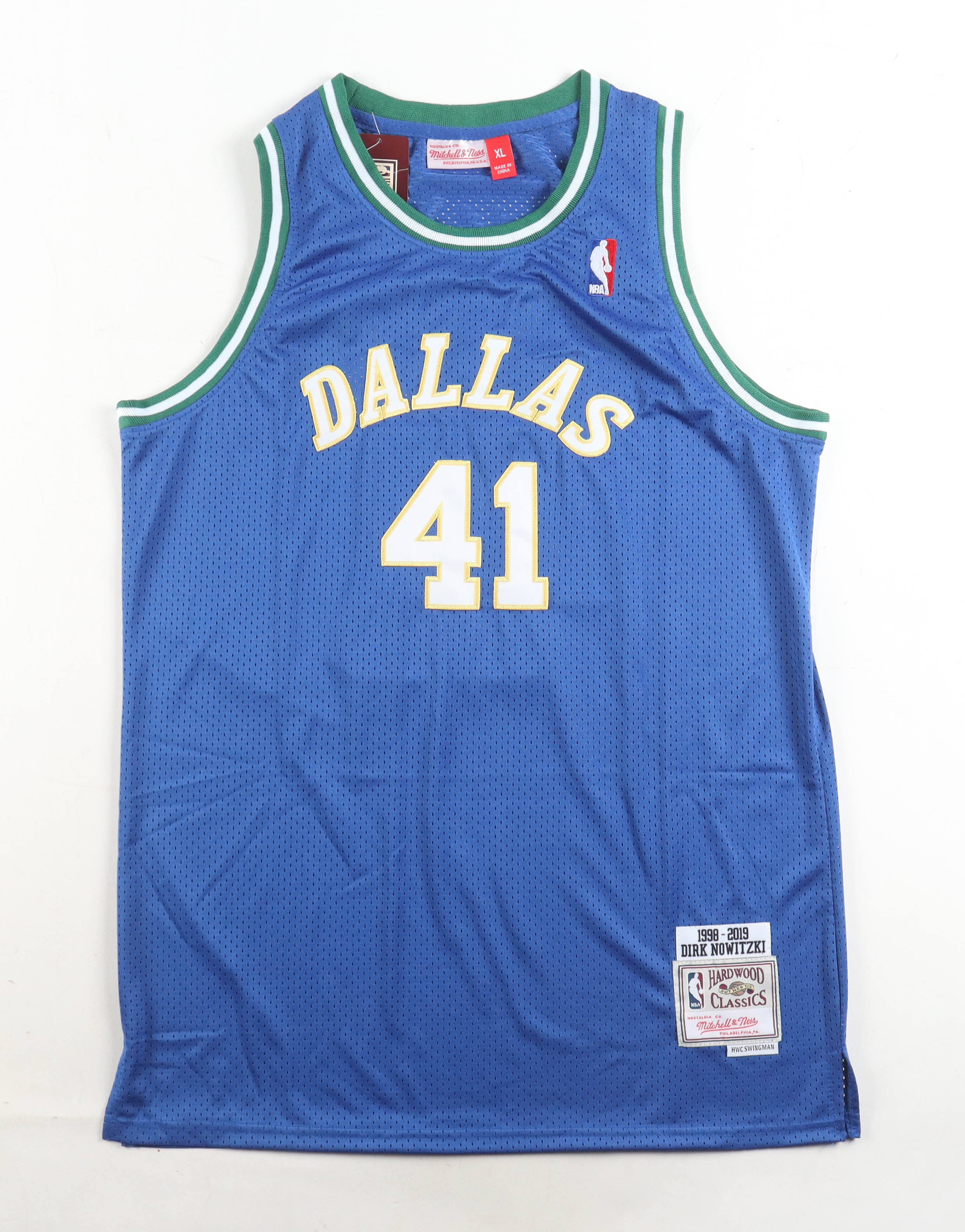 Mitchell & Ness jersey with everything sewn on, size XL. Hand-signed by Dirk Nowitzki (Dallas Mavericks, HOF).