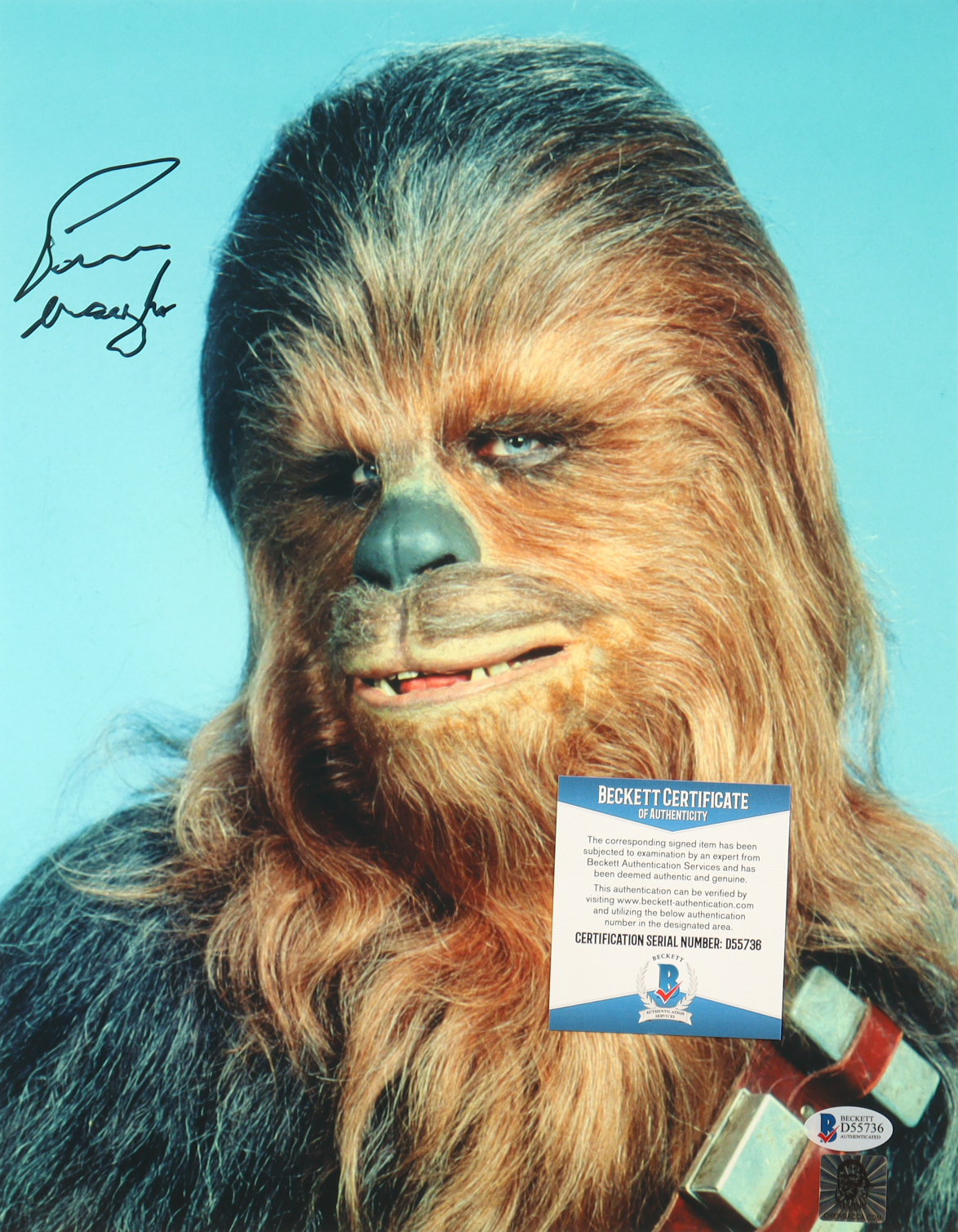 Photo measures 11" x 14" in size and has been hand-signed by Peter Mayhew (D. 2019).