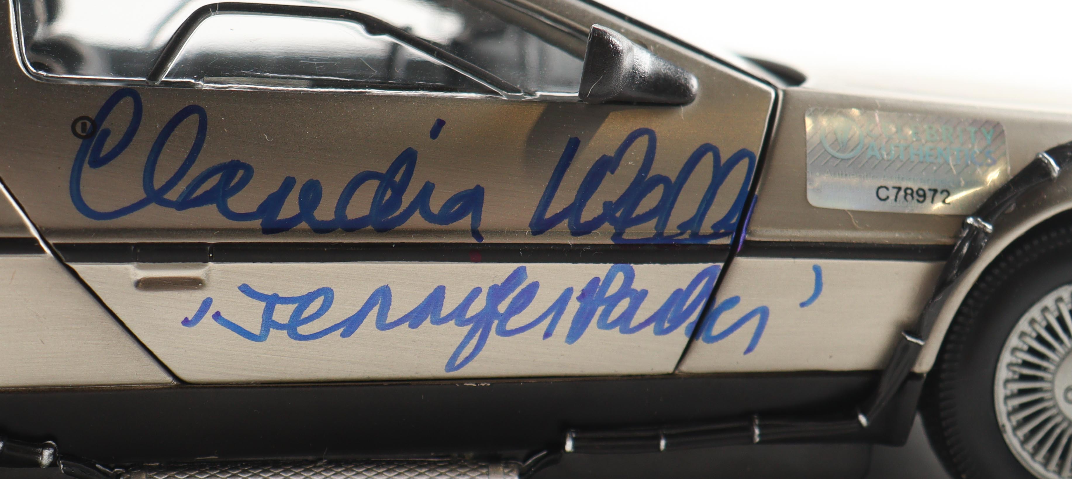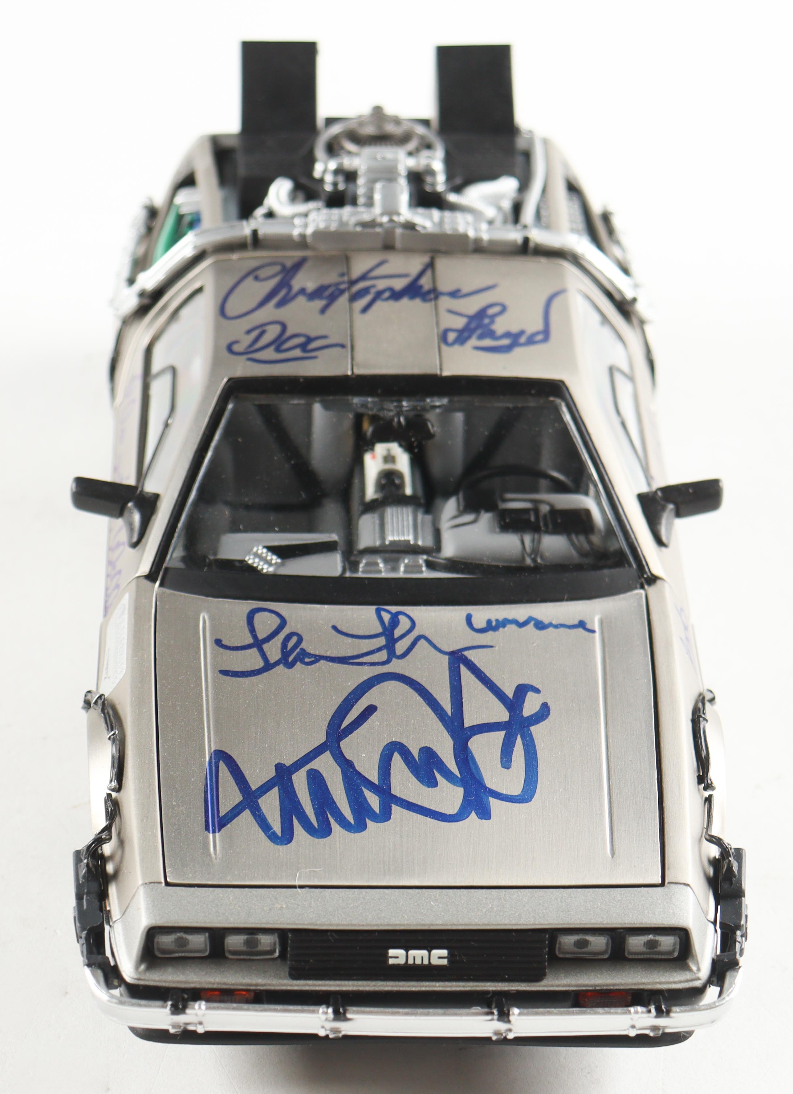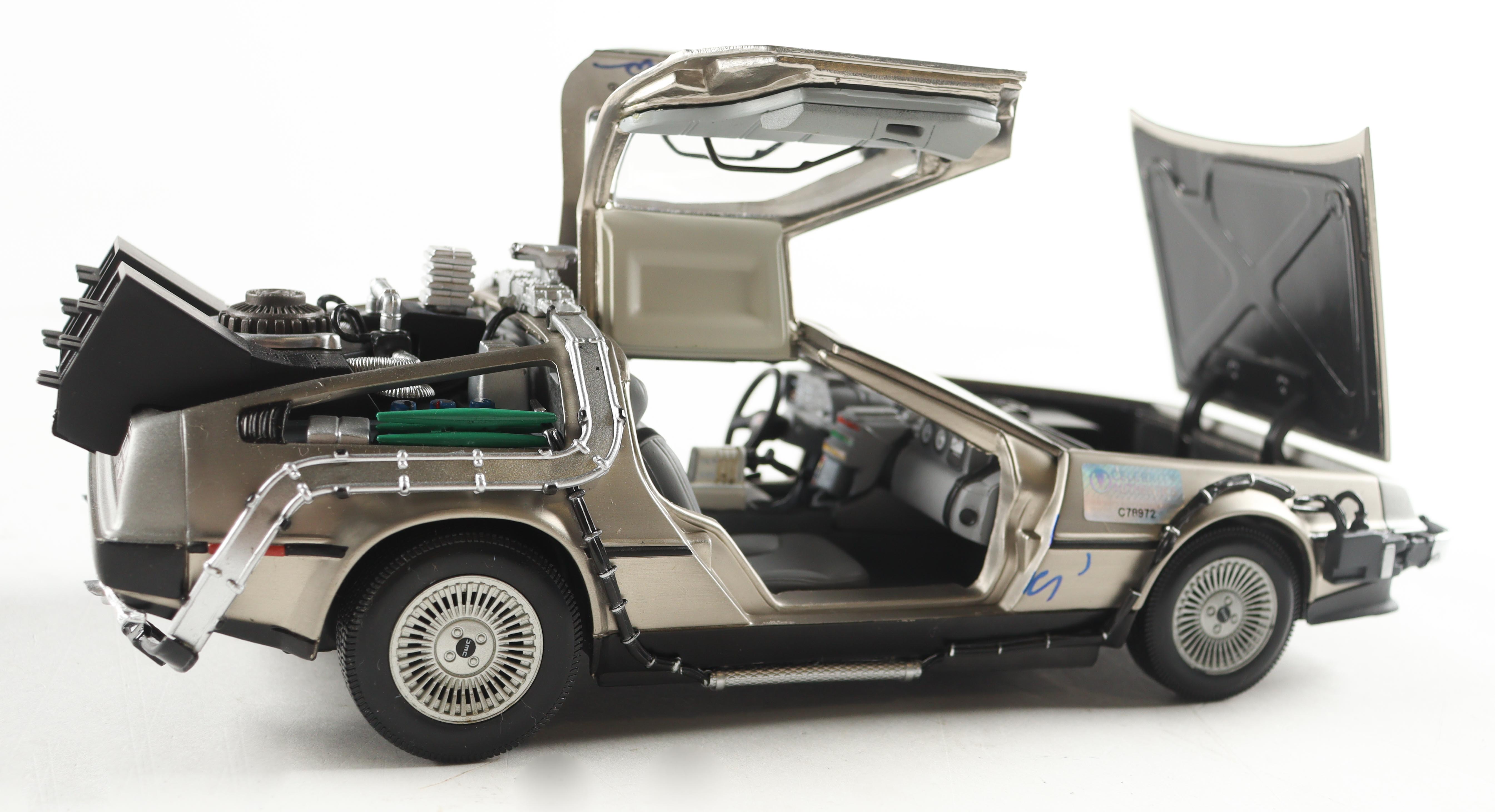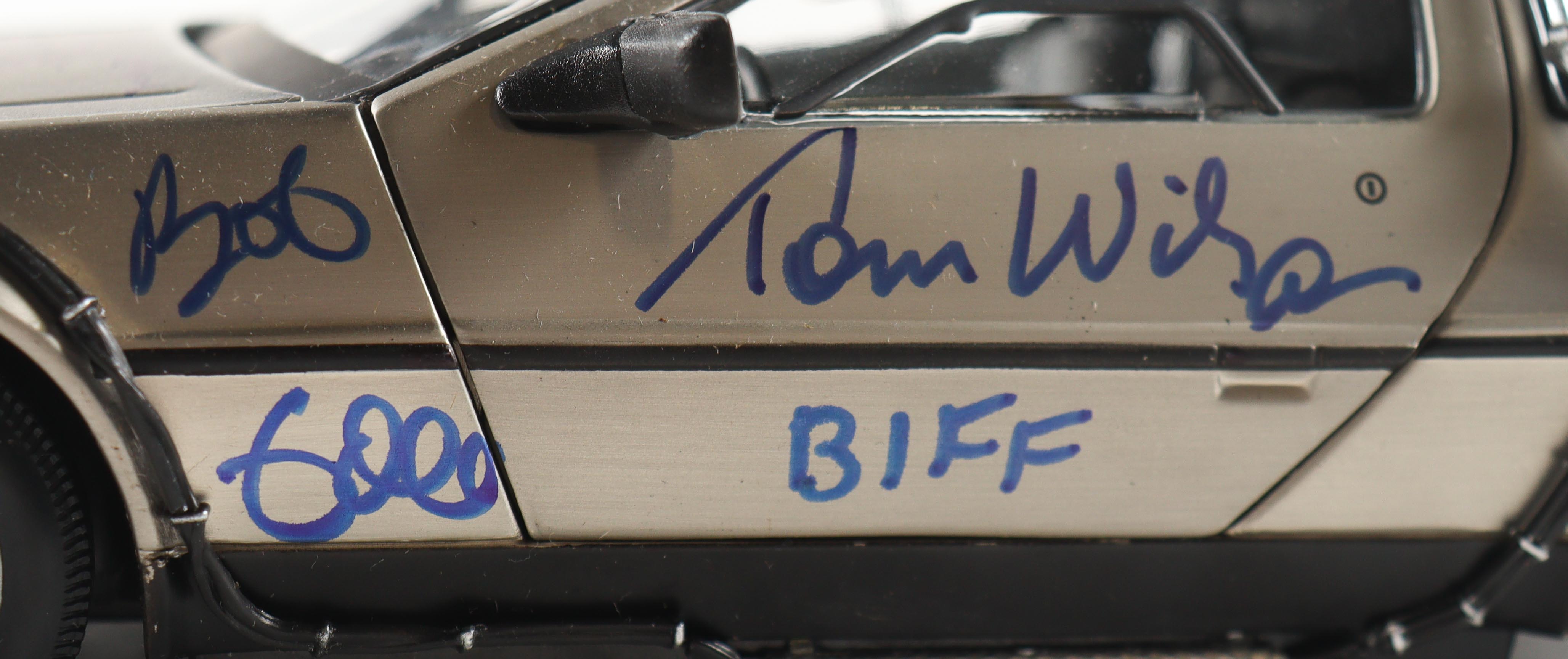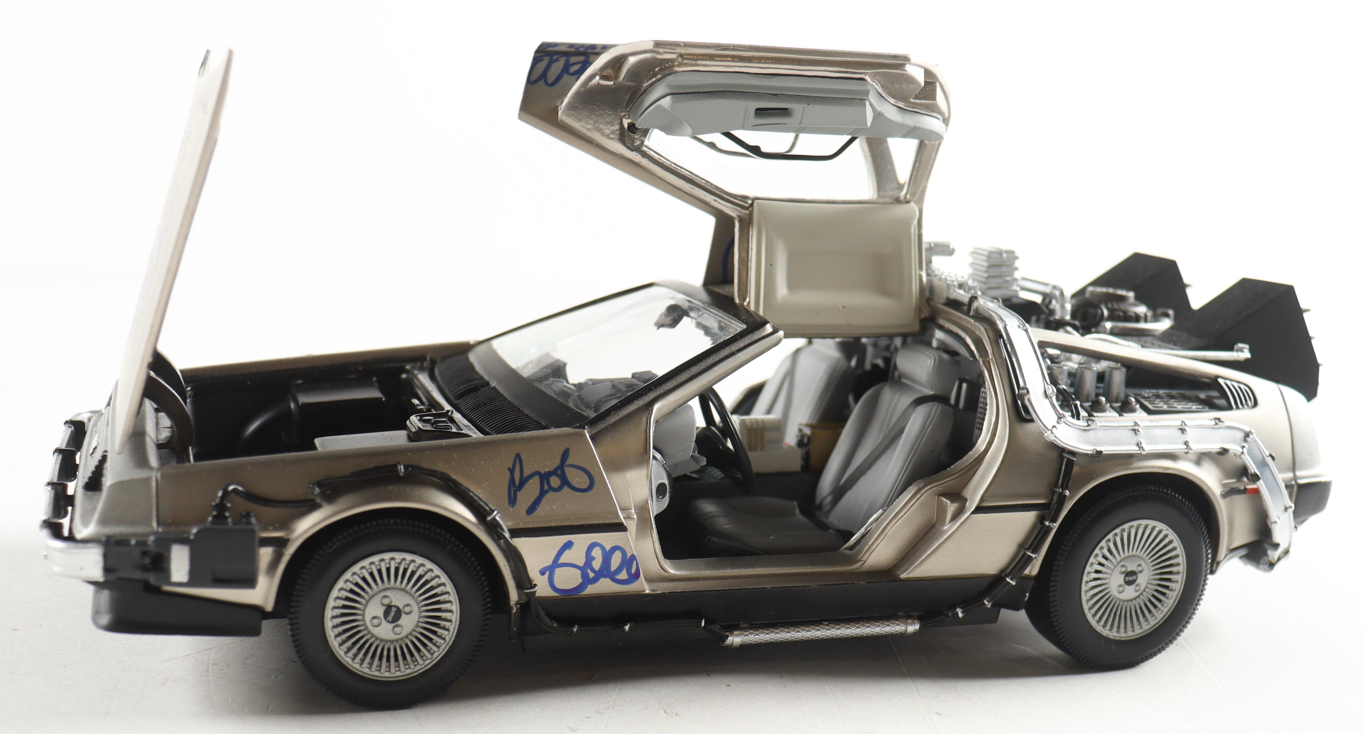 "Back to the Future" die-cast car has been hand-signed by (5) members of the cast including Christopher Lloyd, Lea Thompson, Michael J. Fox, Tom Wilson, and Bob Gale!