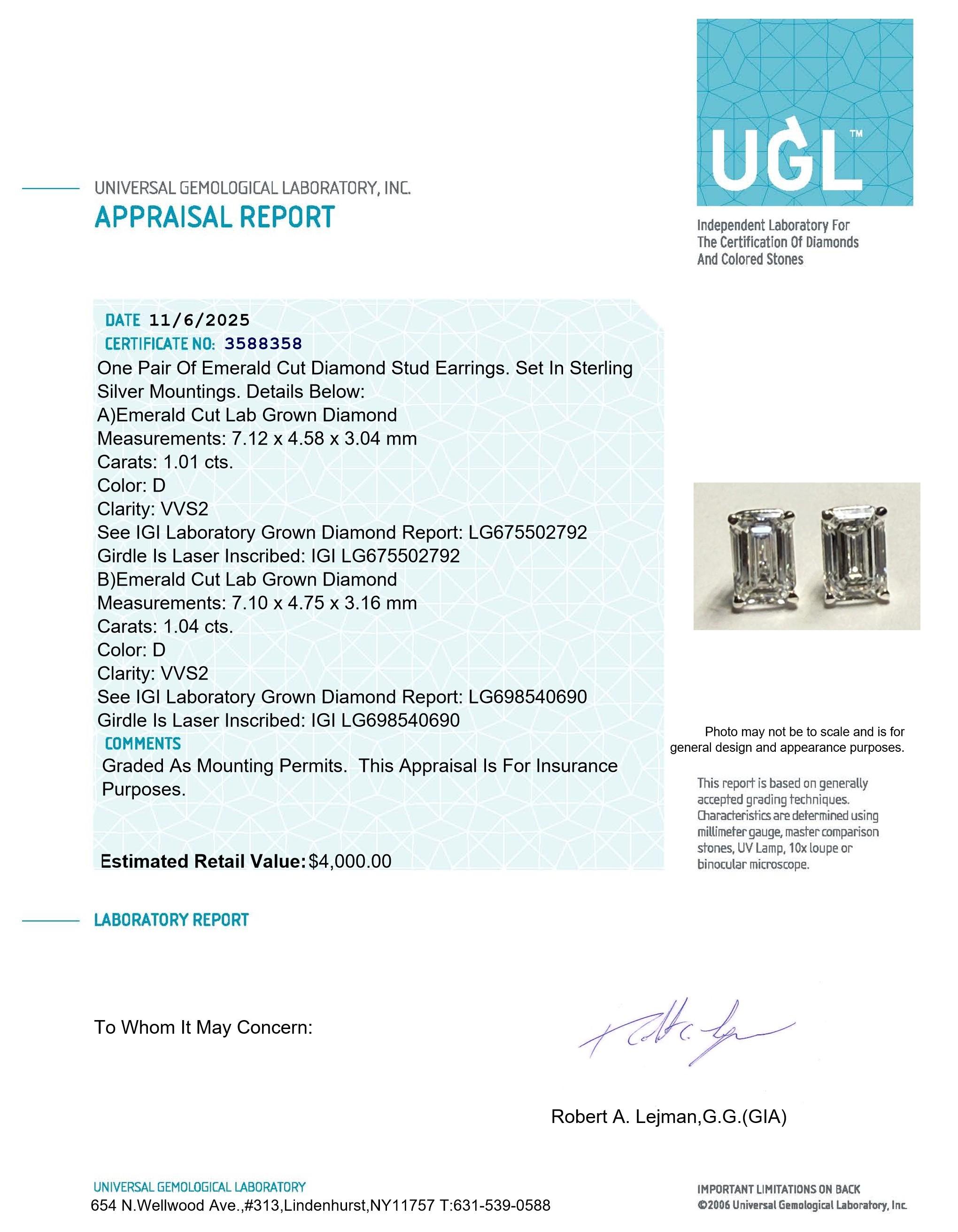 New 2.05 CTW Lab Grown Pair of Diamond Earrings D, VVS2 | Estimated Retail Value: $4,000 (UGL & IGI)