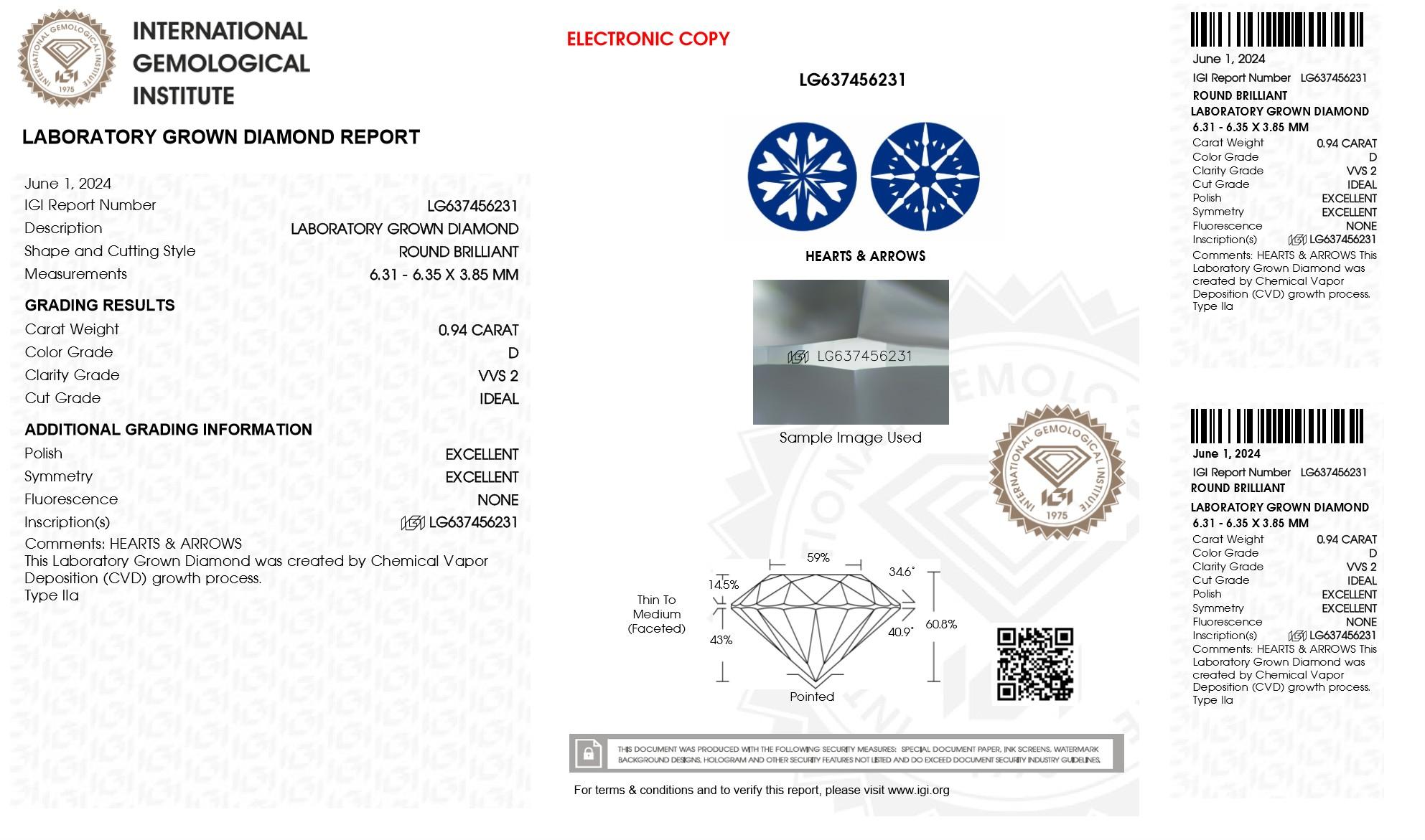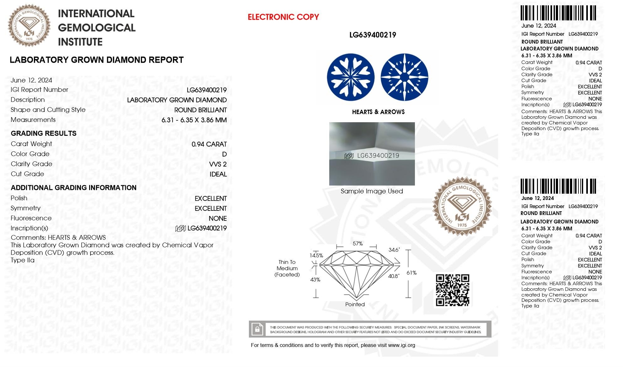 The diamonds feature precision laser inscriptions with the IGI certificate numbers, ensuring authenticity and traceability.