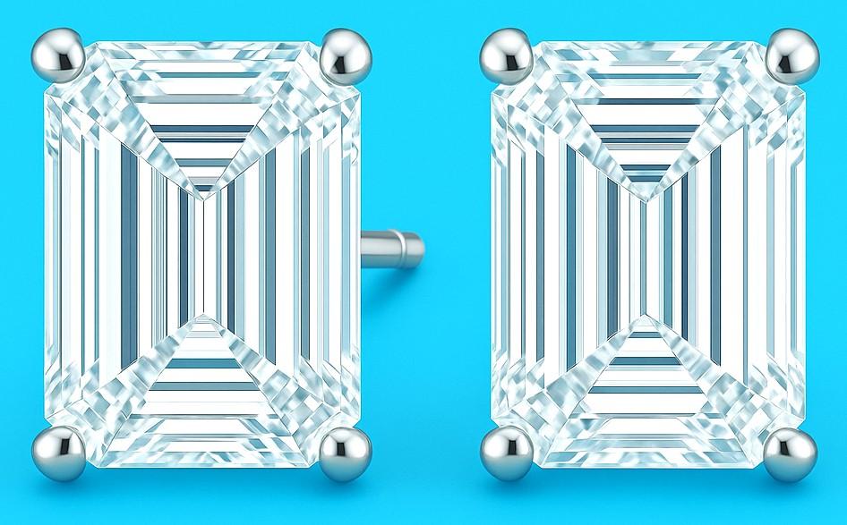 One Pair Emerald Cut Diamond Stud Earrings. Set In Sterling Silver Mountings.